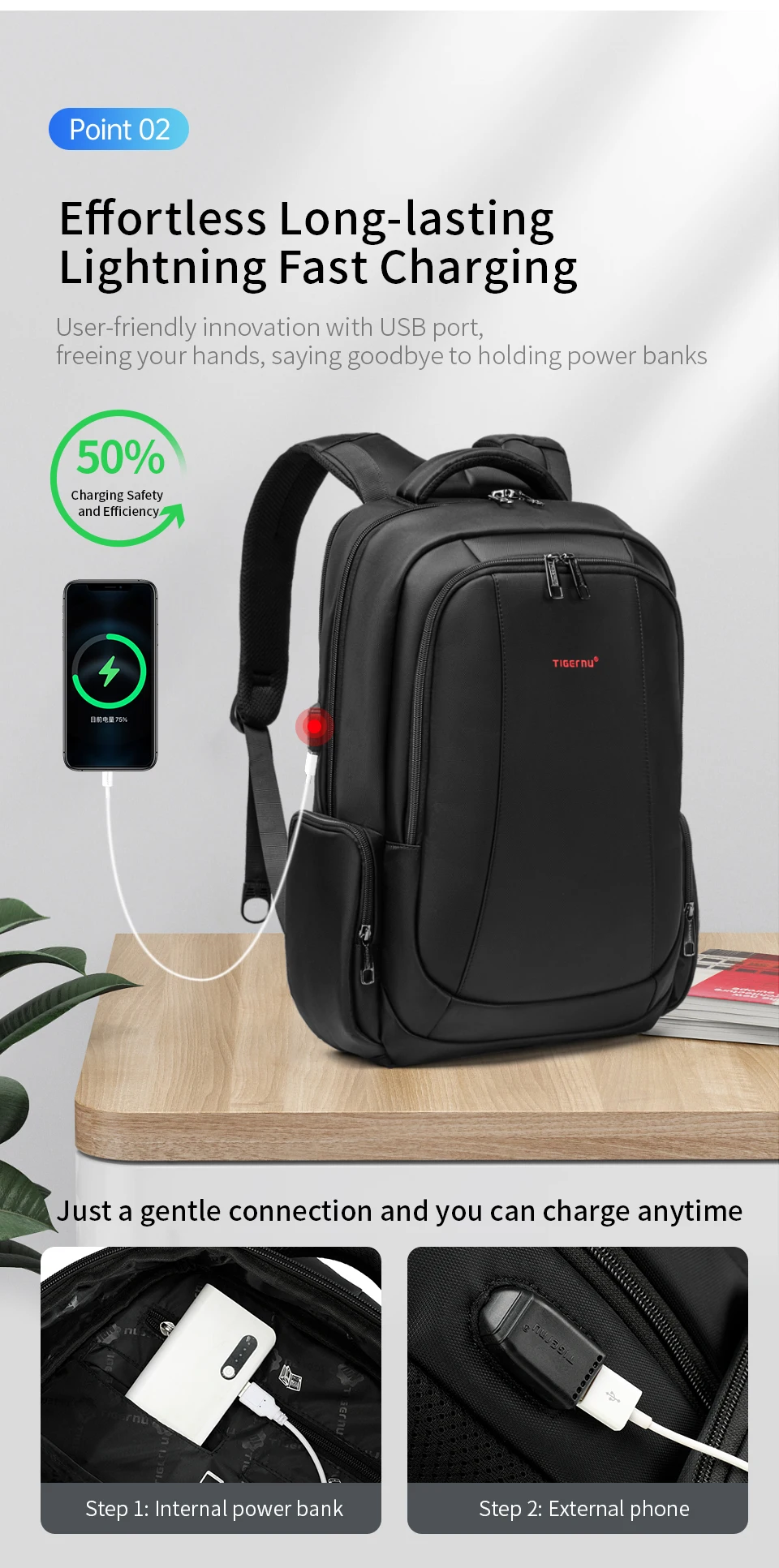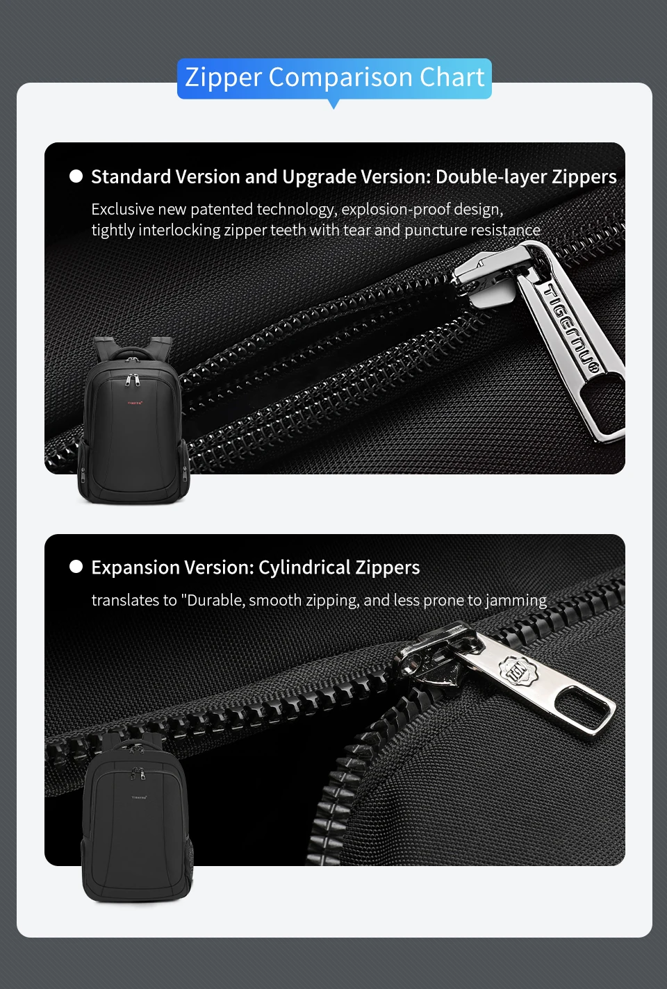 1.Zíper de camada dupla, zíper à prova de explosão, anti-roubo e maior vida útil e garantia de 10 anos