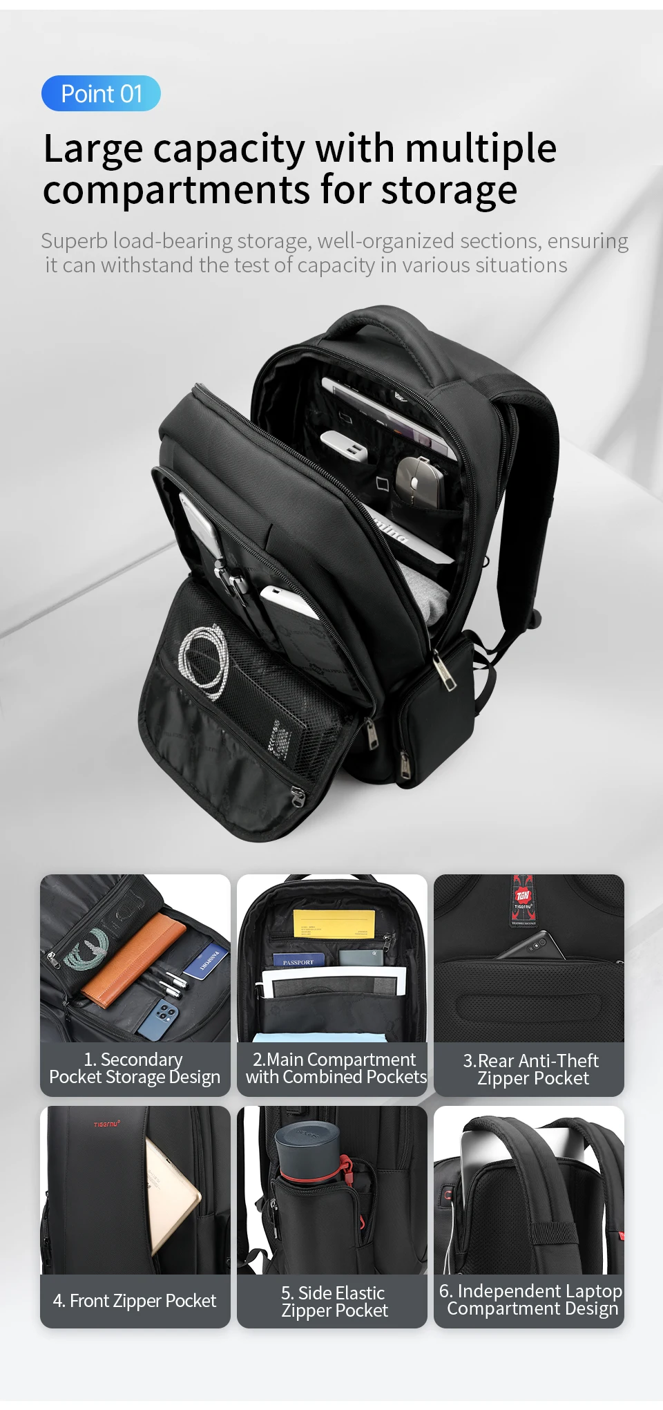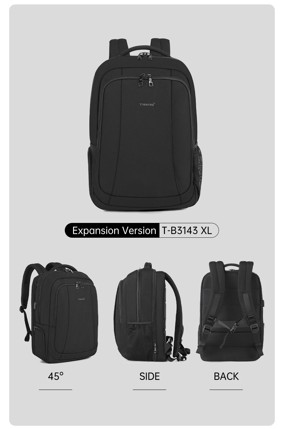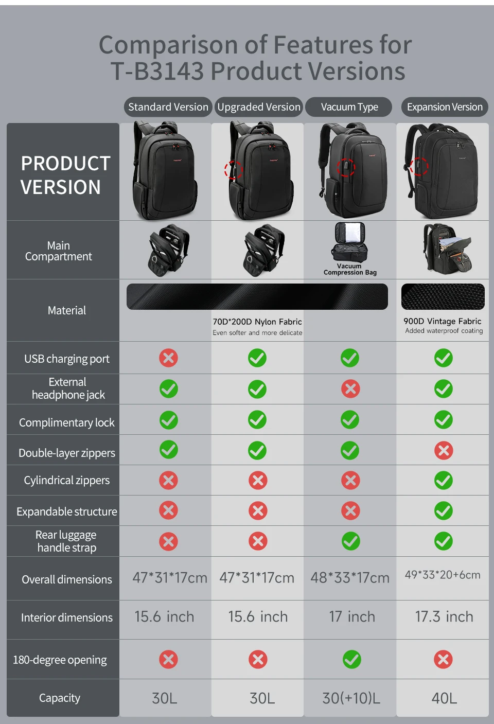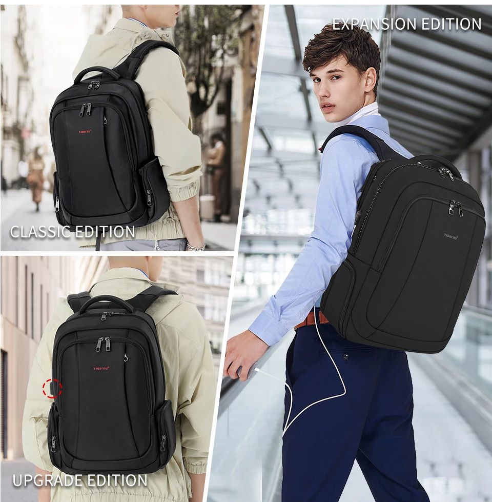 3.Versão clássica com design de grande capacidade de 30L e versão expansível com grande capacidade de 40L e bolsos multifuncionais: compartimento principal, compartimento independente para laptop, bolso traseiro oculto antirroubo, ect;