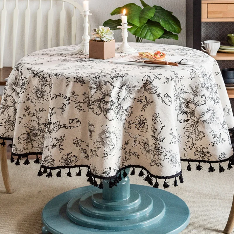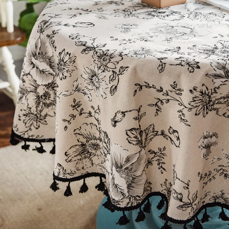 Toalha de mesa de linho de poliéster com borlas, capa de mesa à prova de poeira com impressão de peônia preta, para cozinha, jantar, café, decoração de casa