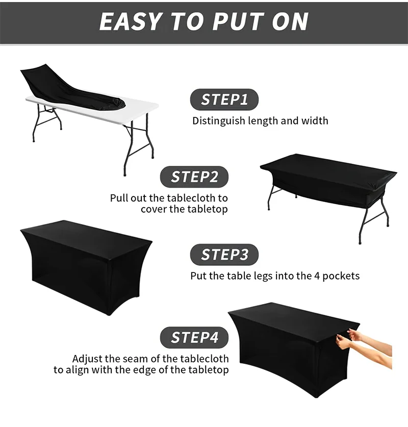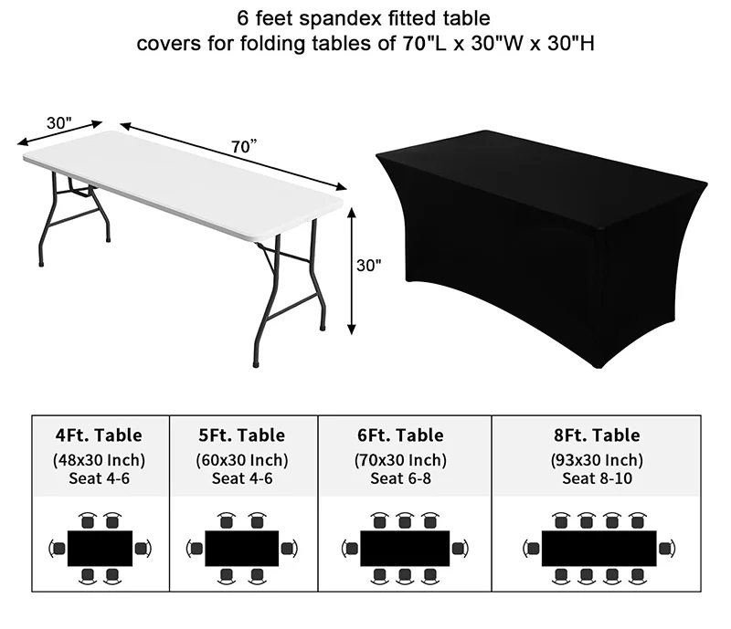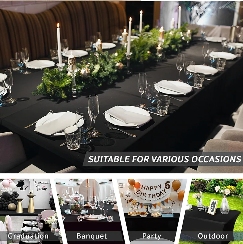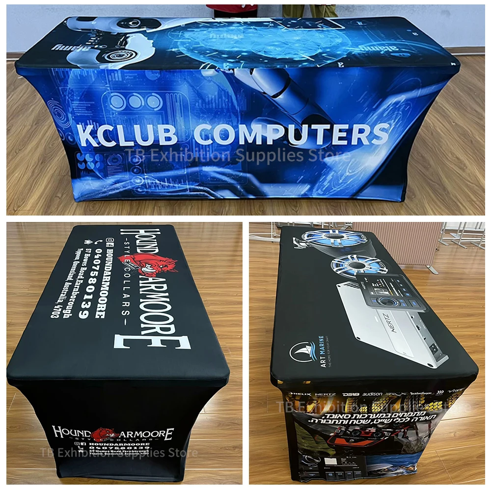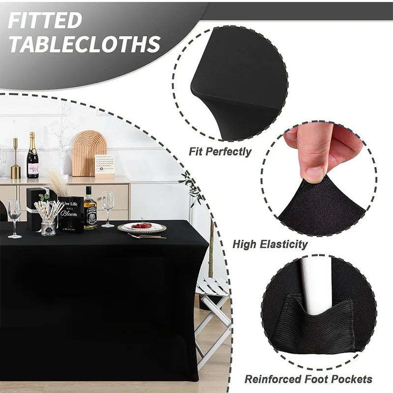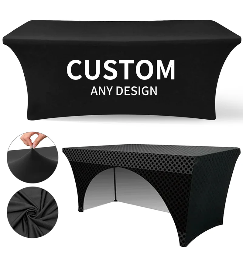 Toalha de mesa elástica com design personalizado, 4 pés/6 pés/8 pés, para hotel, casamento, festa de aniversário, banquete, estiramento, decoração de balcão de exposição