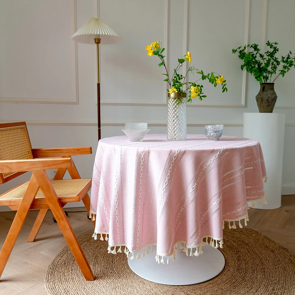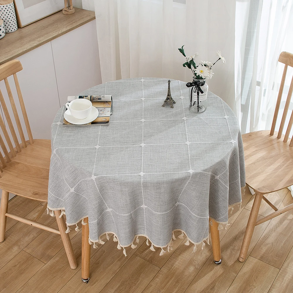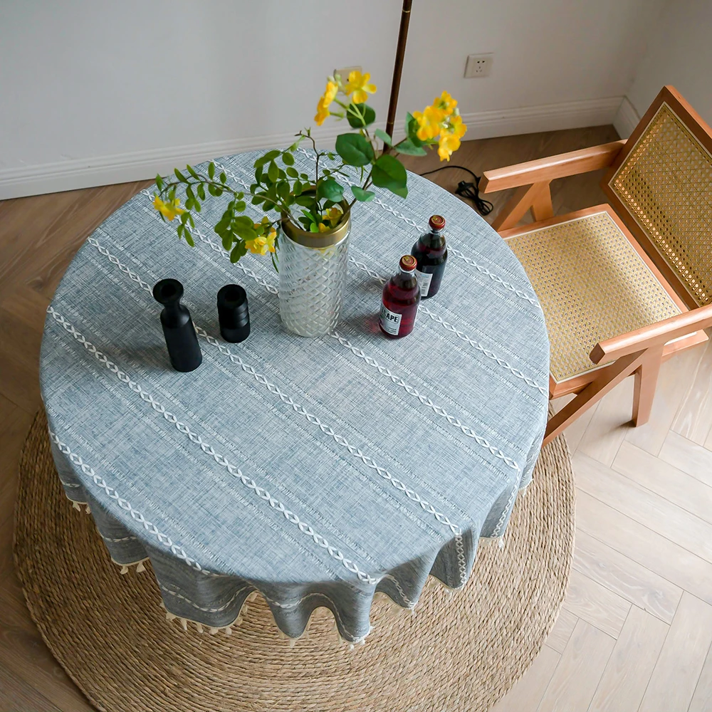 Toalha de mesa redonda bordada sólida com borlas, capa de mesa à prova de poeira para cozinha, sala de estar, jantar, festa, decorações de mesa