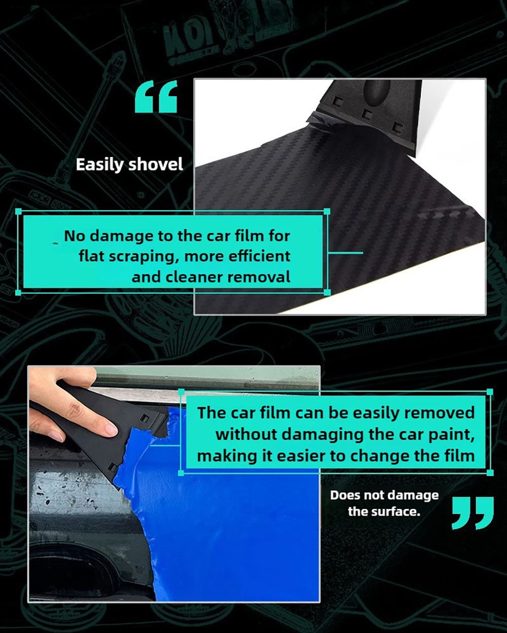 --- Lâmina de plástico alargada e alargada, com 7,4 cm de largura, facilitando a remoção de manchas e películas ou adesivos de carro em uma grande área.