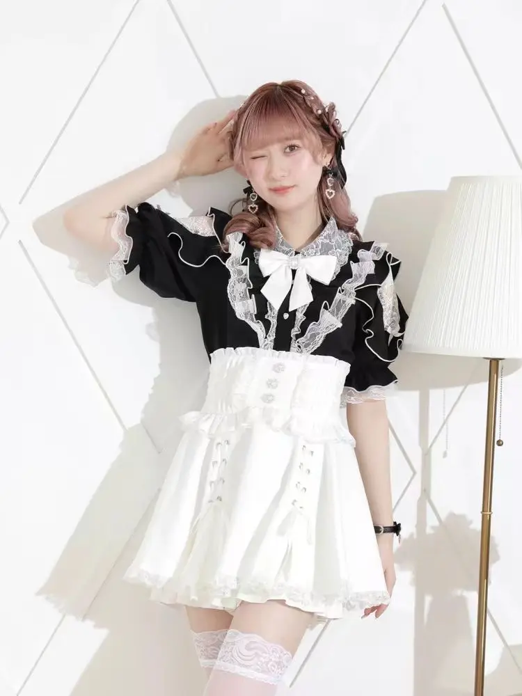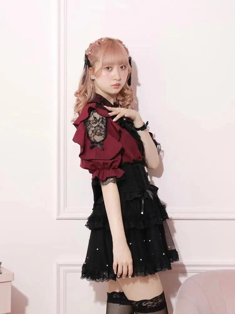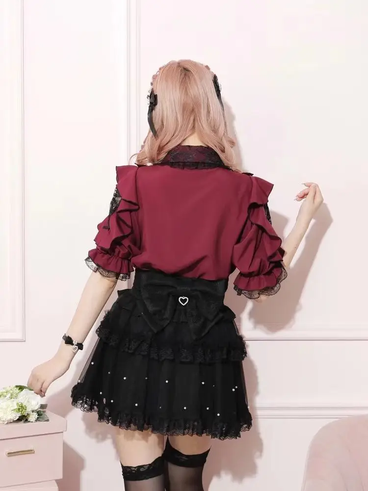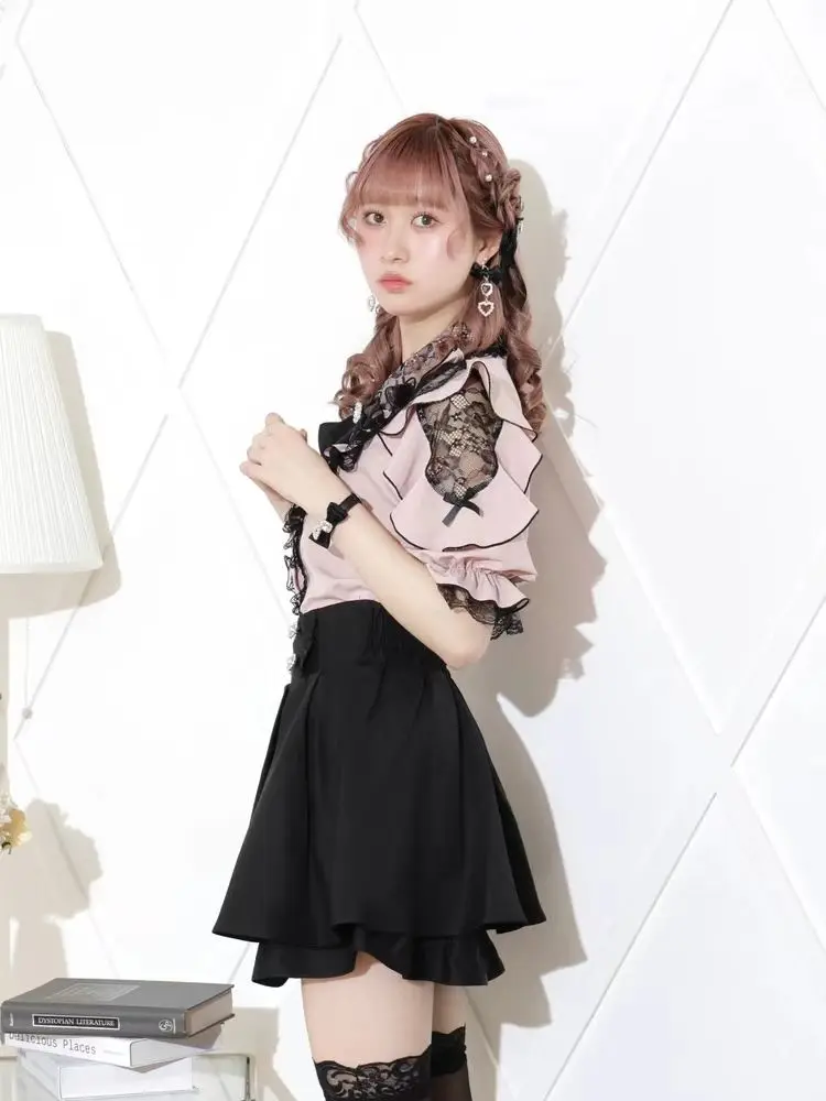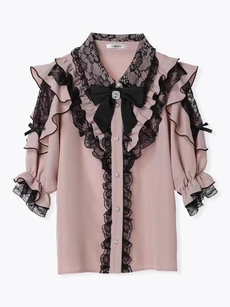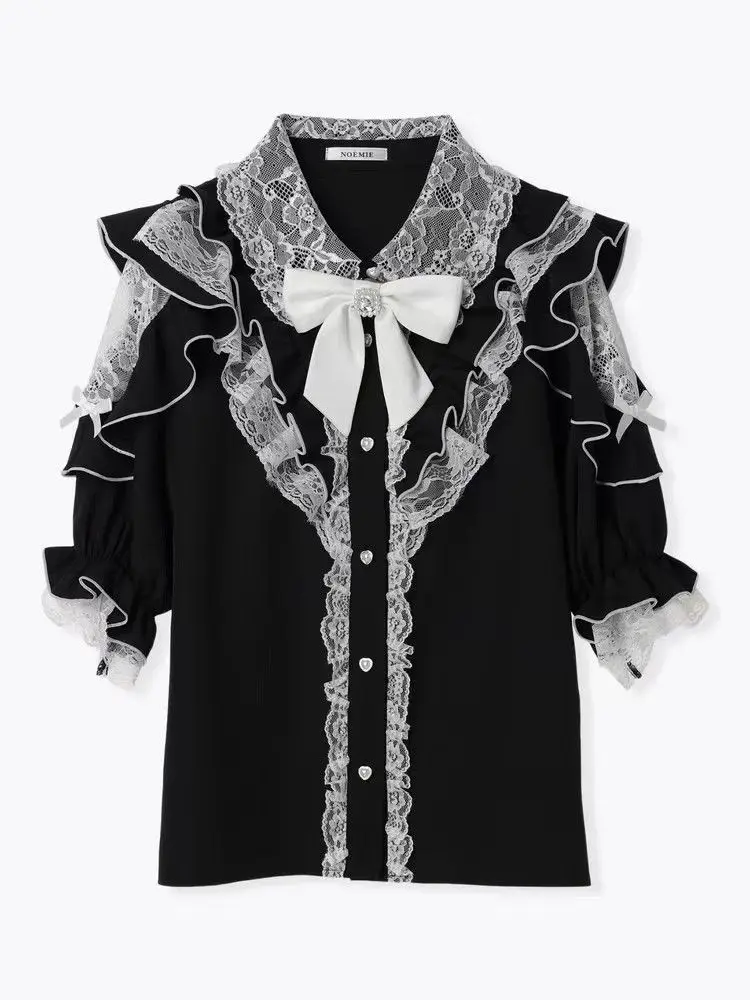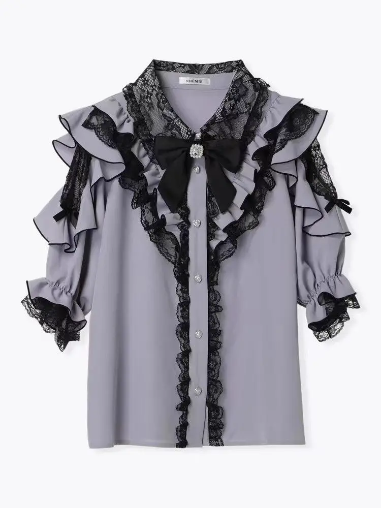 Top com laço e babados inspirado noemi – Blusa japonesa escura feminina com ombros de fora, camisa de manga sino com acabamento em renda para Yami Kawaii e Lolita