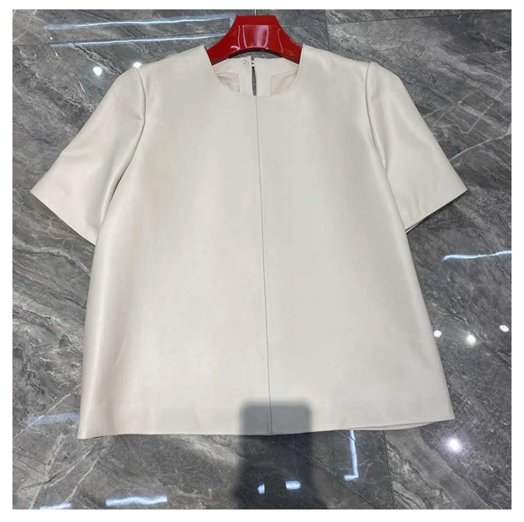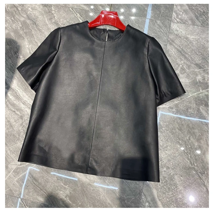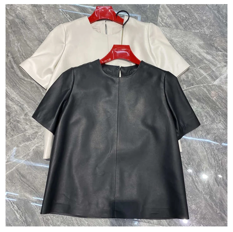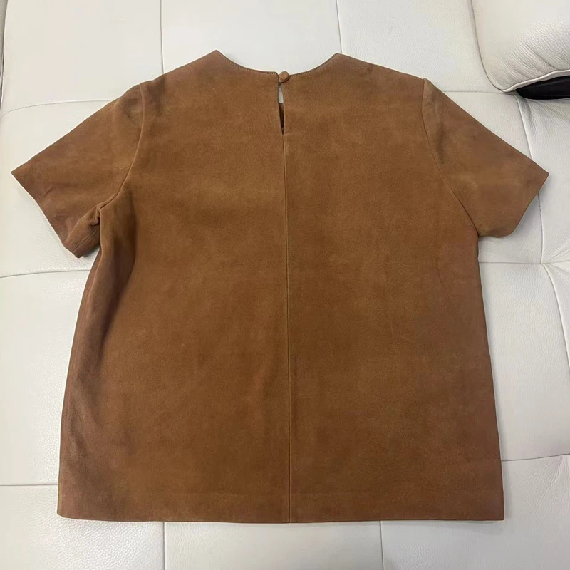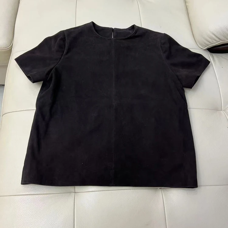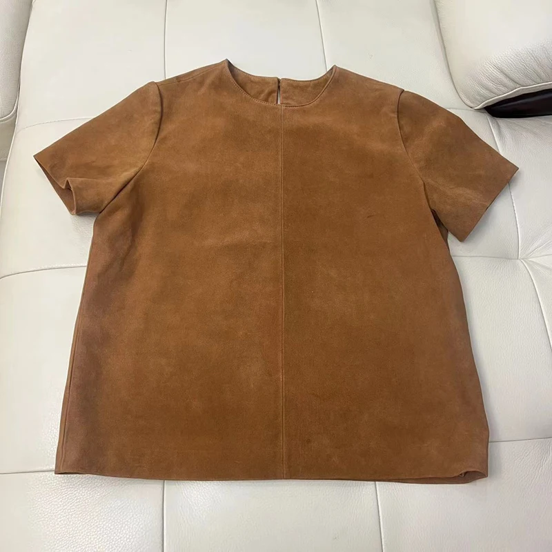 - > Tops de couro genuíno para mulheres 2025 primavera/verão manga curta reta em torno do pescoço pulôver camisas e blusas de camurça fina