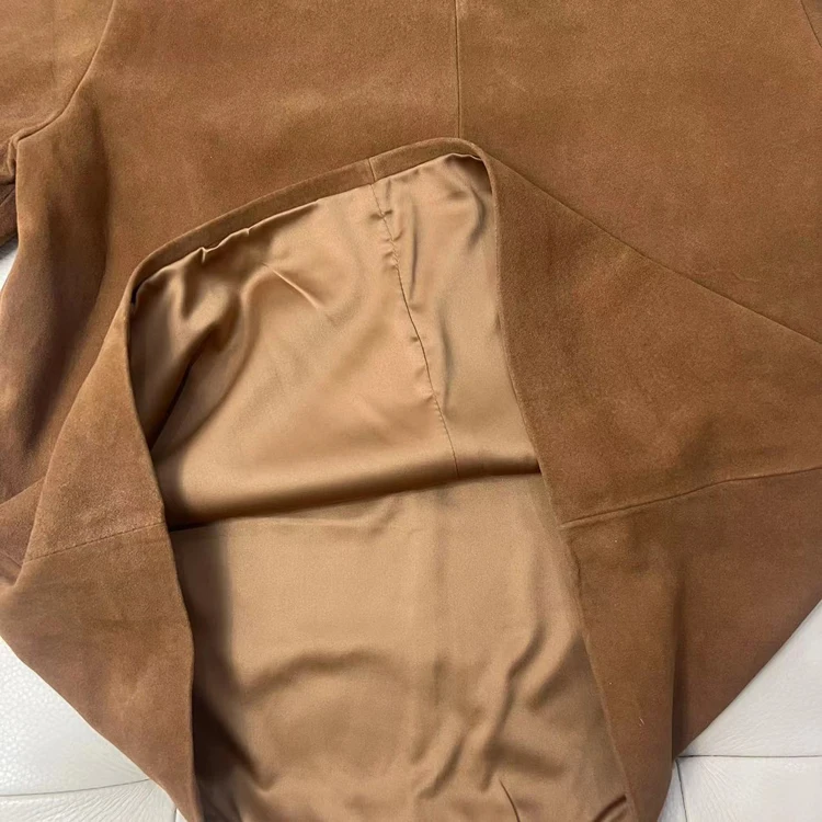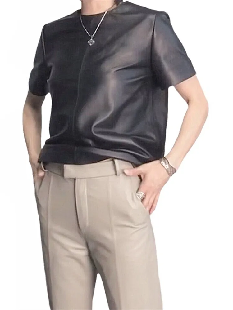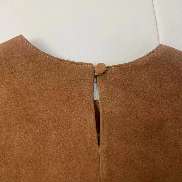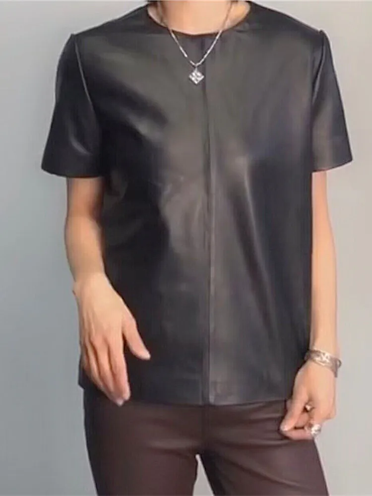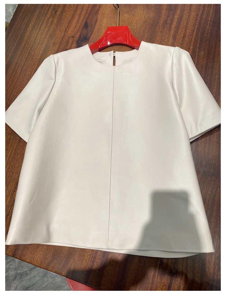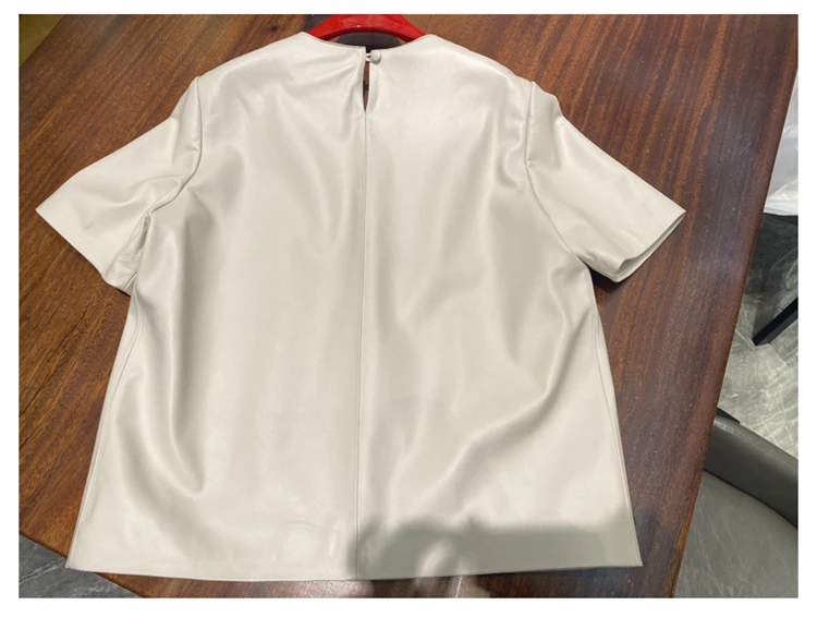 - > Tops de couro genuíno para mulheres 2025 primavera/verão manga curta reta em torno do pescoço pulôver camisas e blusas de camurça fina