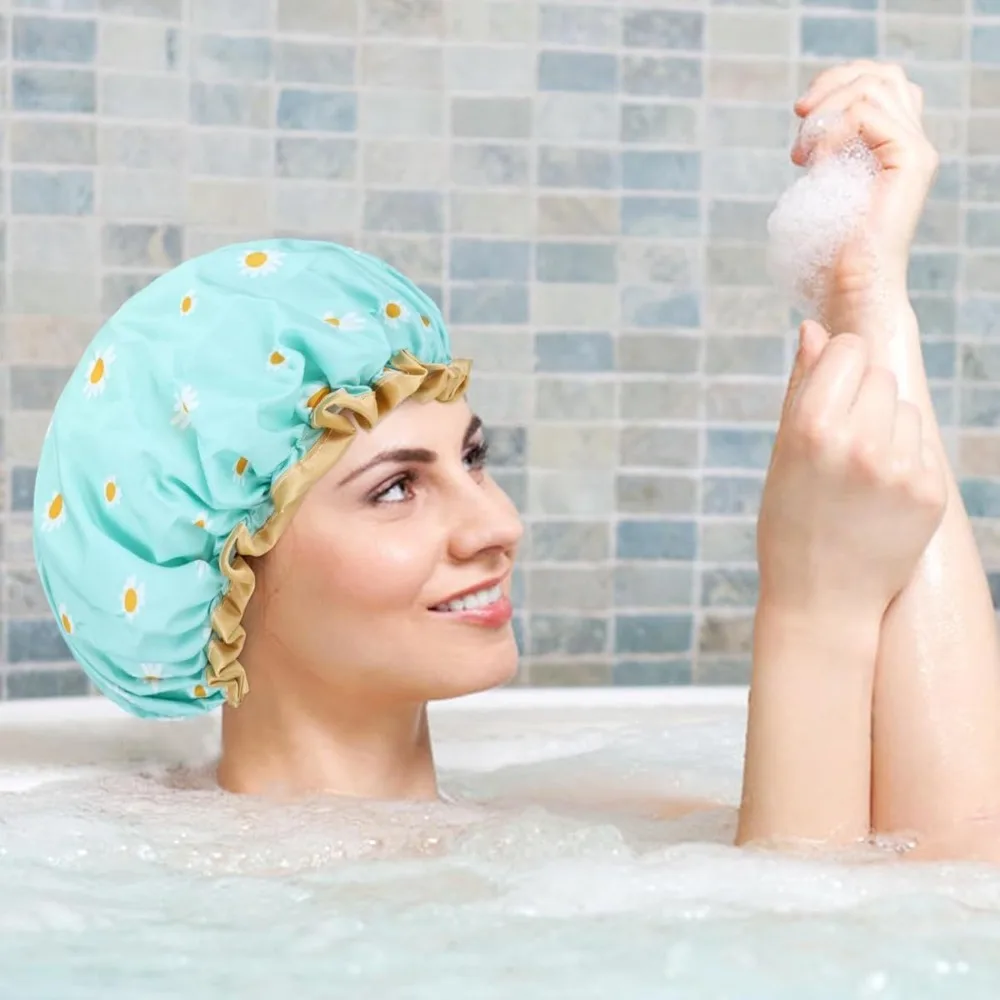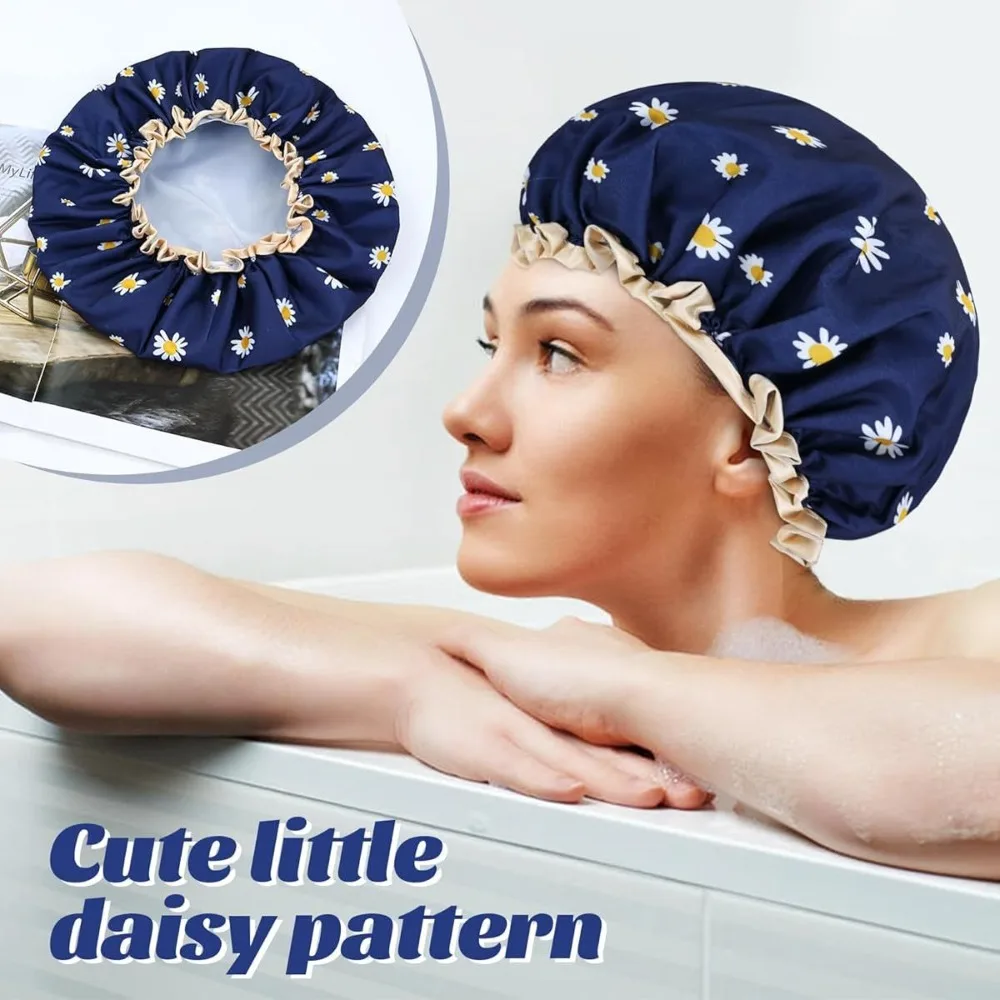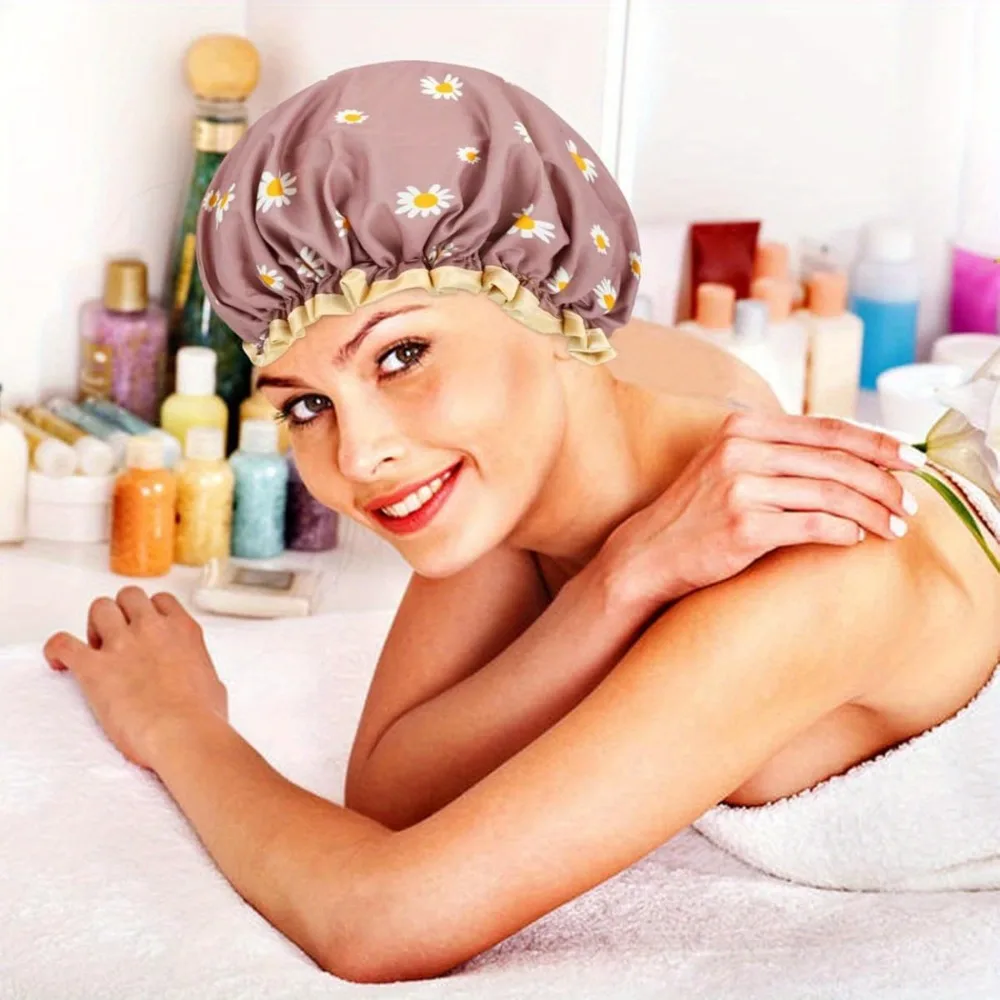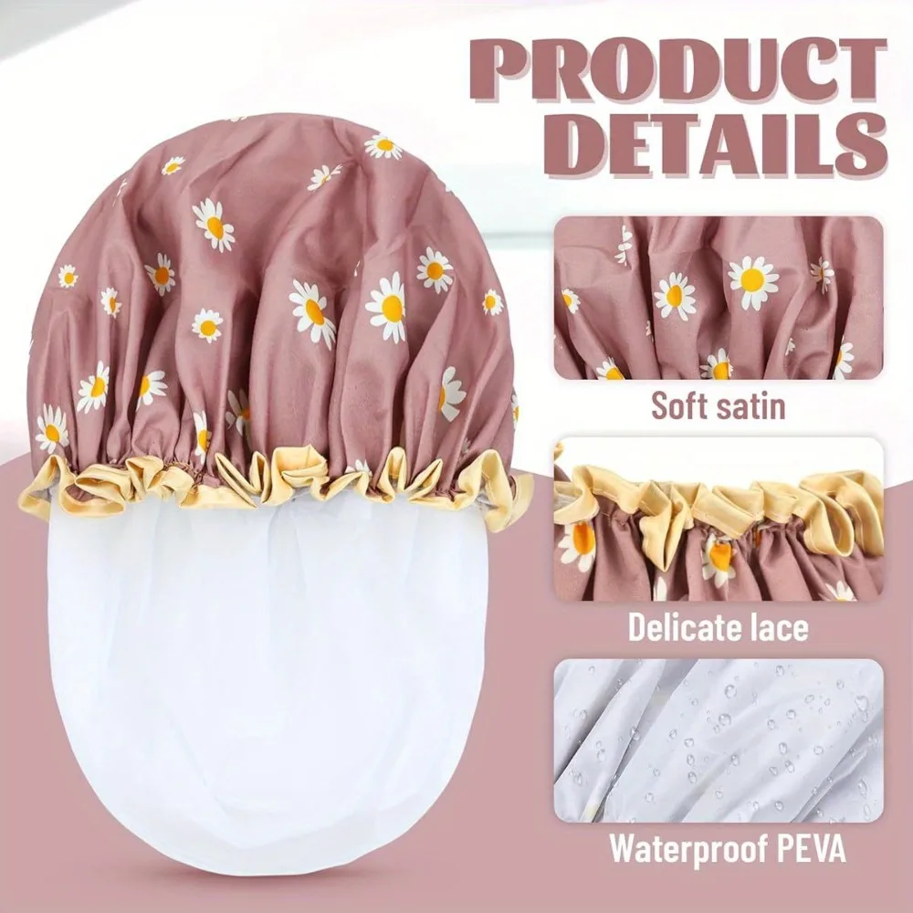 Touca de banho forrada de cetim ajustável à prova d'água para banho com tecido sedoso para viagens femininas