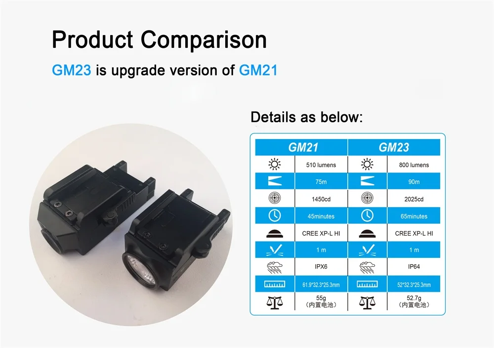 -A posição compacta 52*32.3*25,3 mm do GM23 e o corpo leve de 52,7g tornam-no uma excelente escolha para transporte oculto.E não vai pesar na sua arma.
