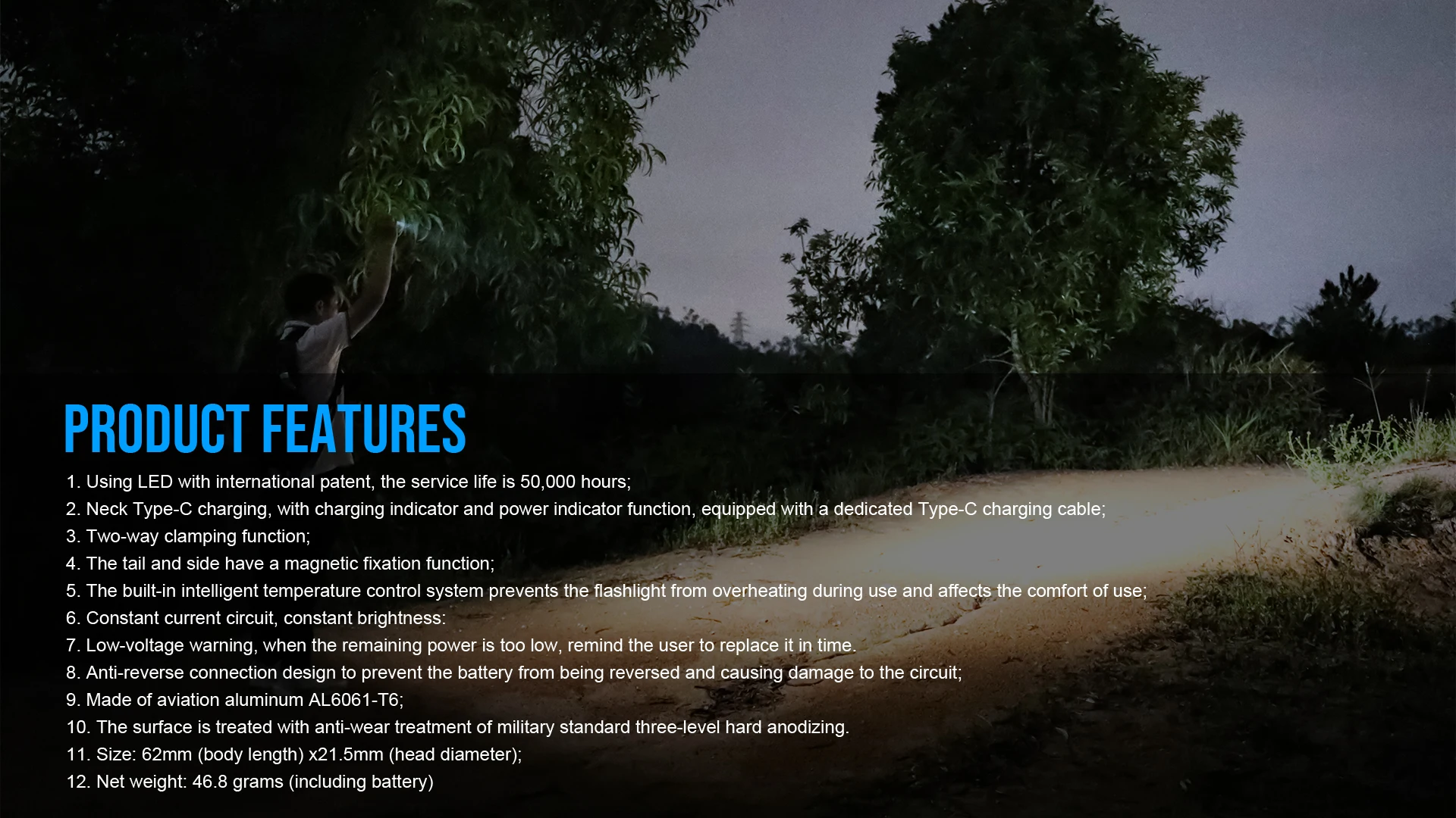 5. The bult-in inteligent temperature control system prevents the flashlight from overheating during use and affects the comfort of use
