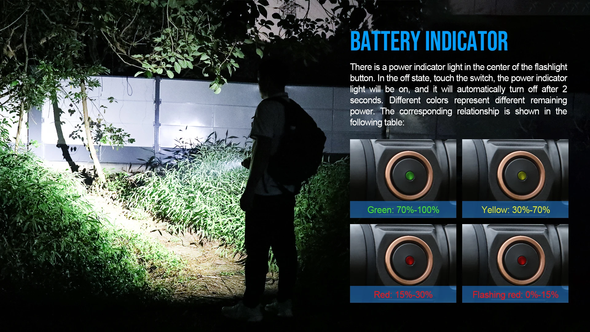 There is a power indicator light in the center of the flashlight button. In the off state, touch the switch, the power indicator light will be on, and it will automatically turn off after 2 seconds. Different colors represent different remaining power.The corresponding relationship is shown in the following table: