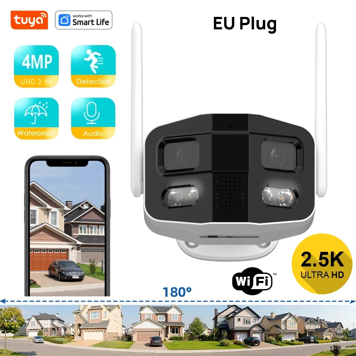 Tuya Smart 4MP 2.5K Lente Dupla Grande Largura 180°Câmera externa de vigilância de segurança com detecção móvel/visão noturna colorida/conversa bidirecional