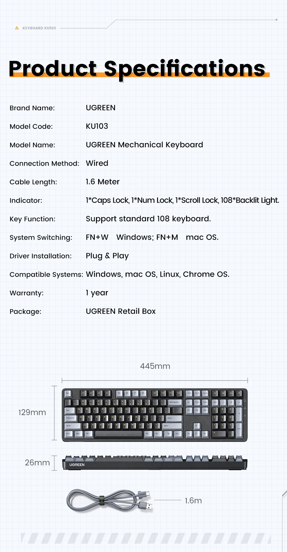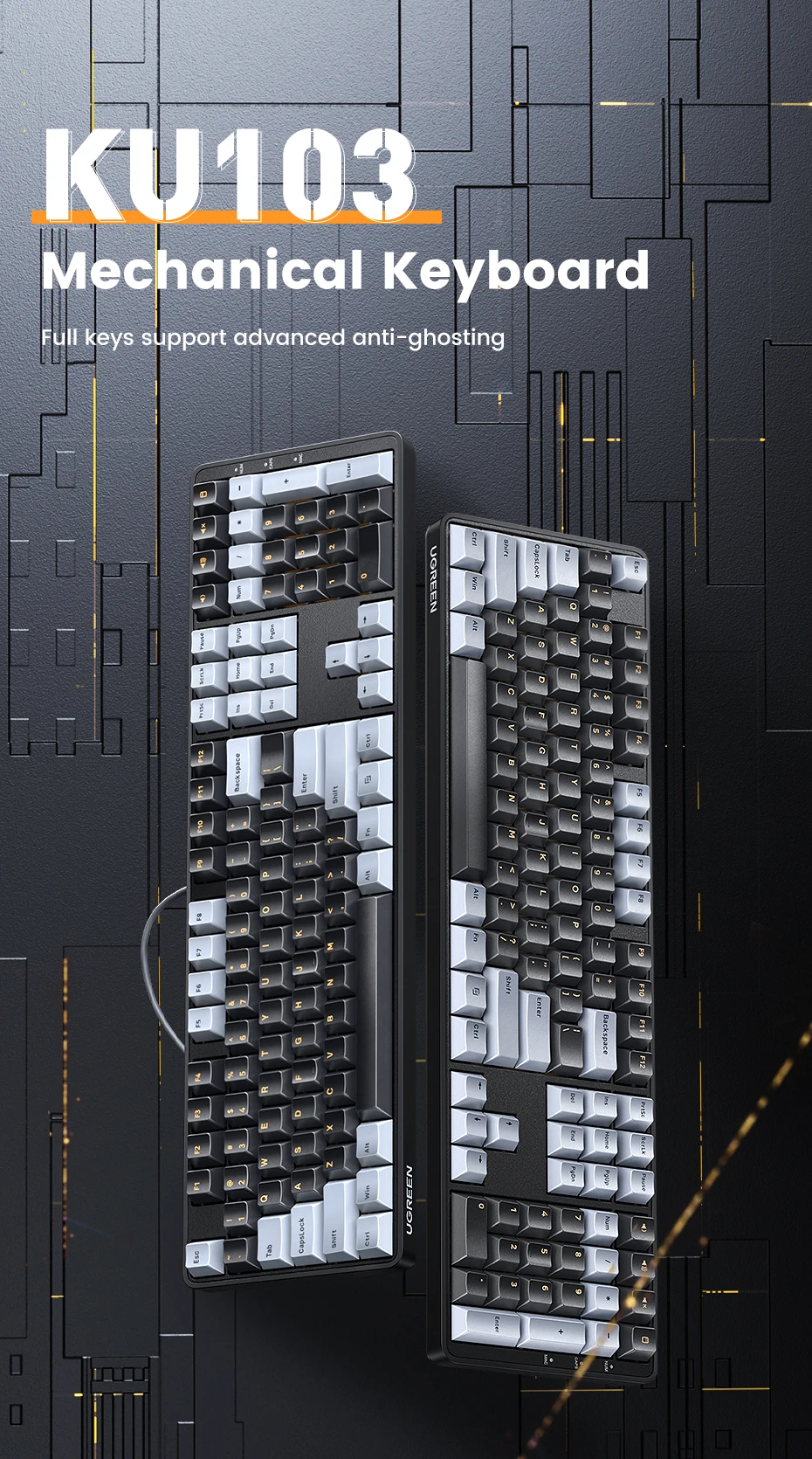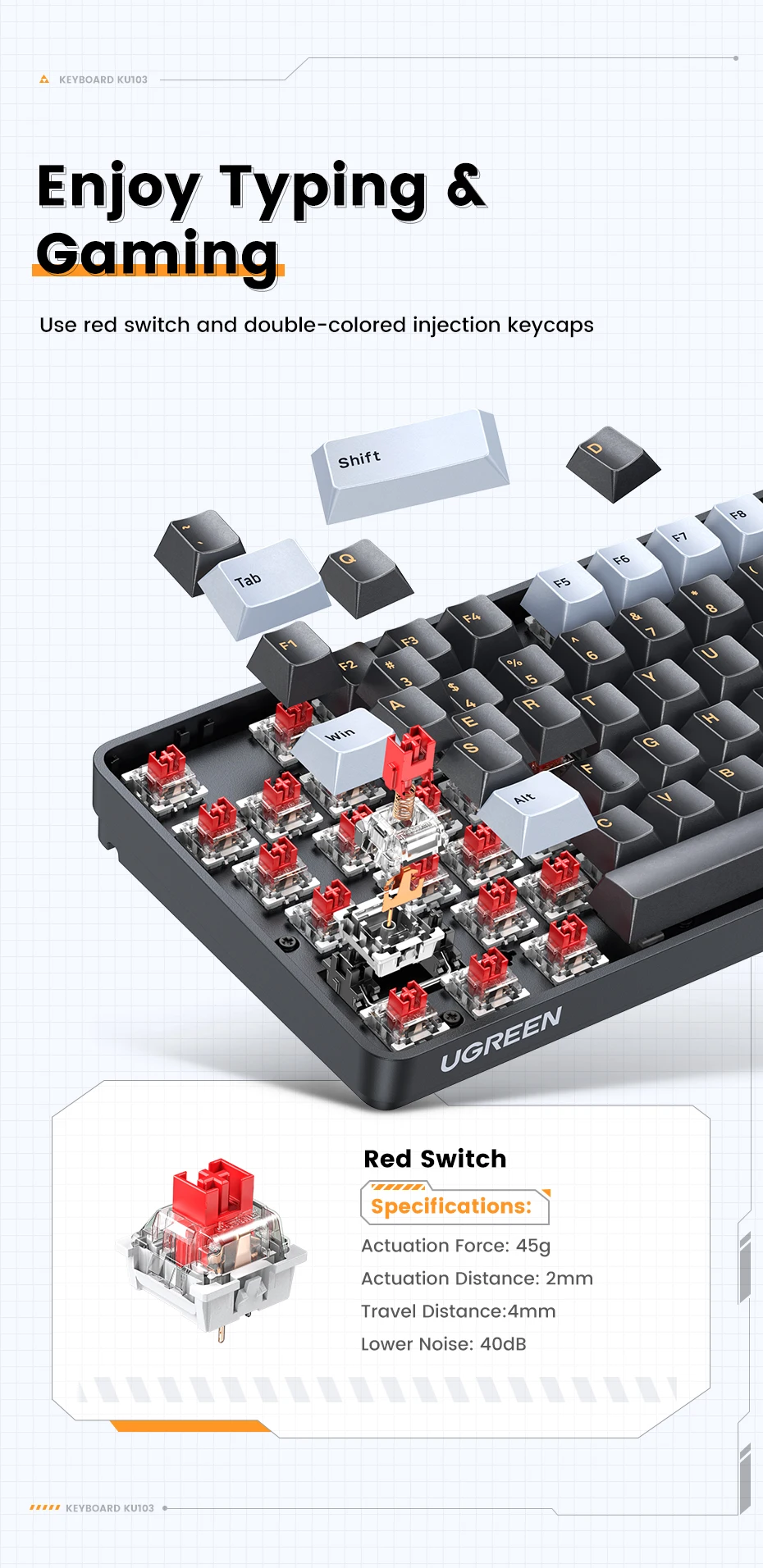 - > UGREEN-108 PBT Keycaps Teclado Mecânico com Fio, Interruptor Vermelho, Russo, Coreano, EN, Área de Trabalho, Laptop, Windows, Mac, OS Gaming