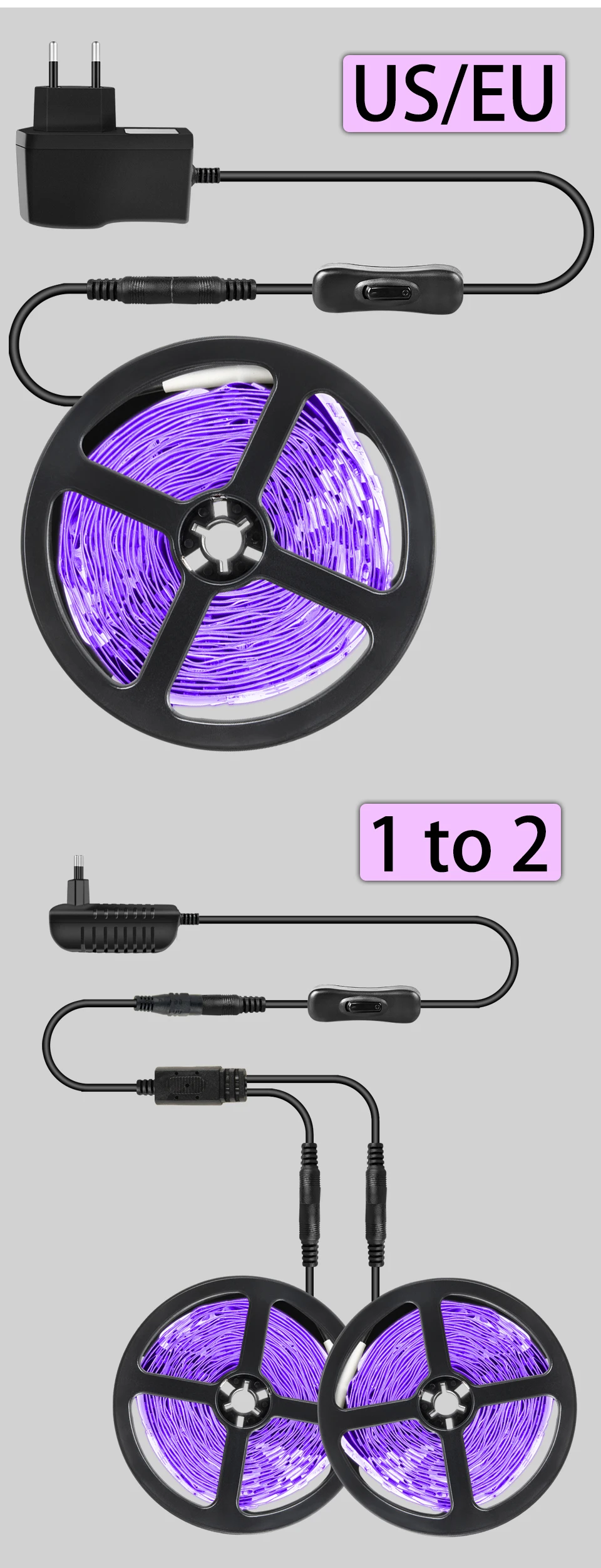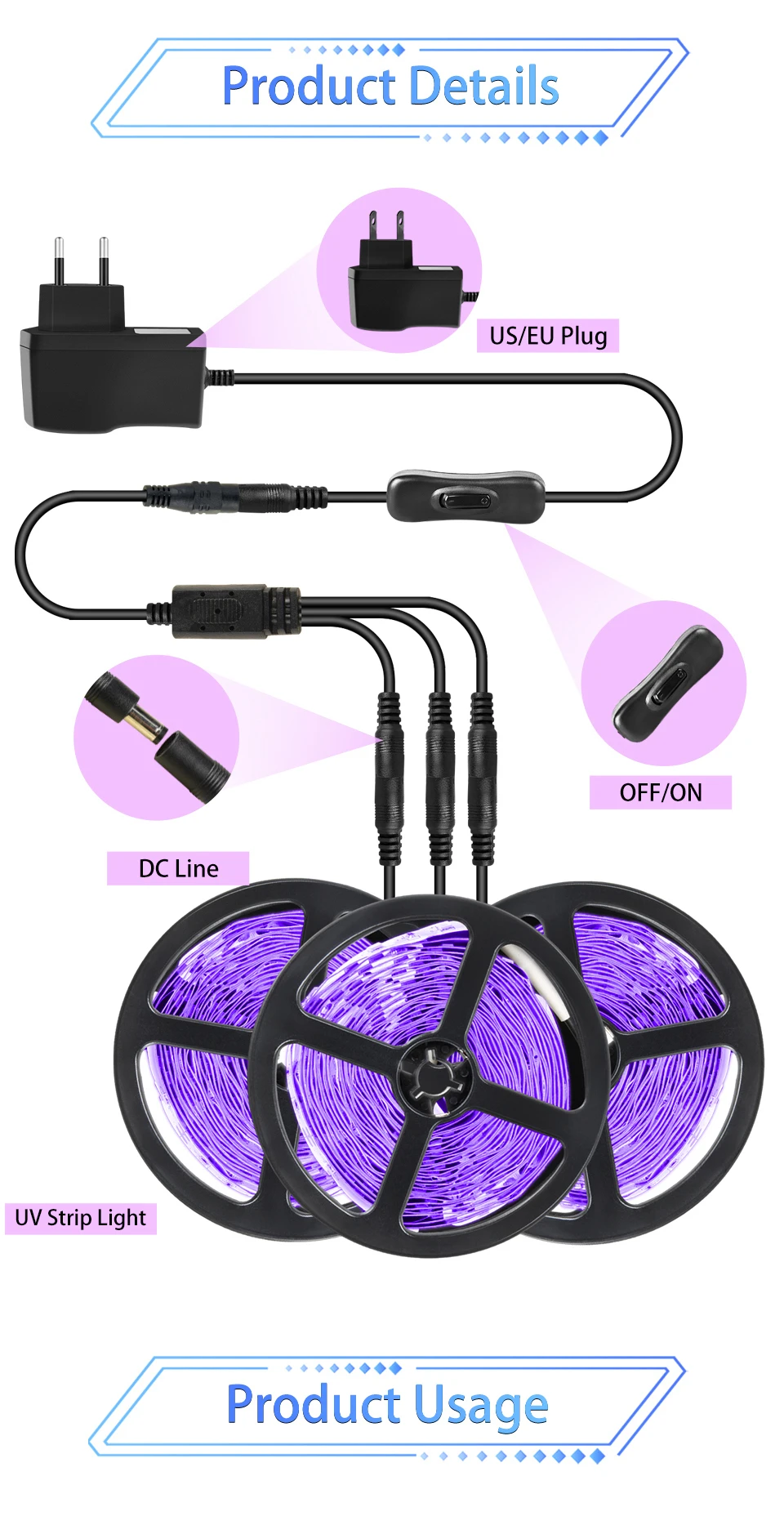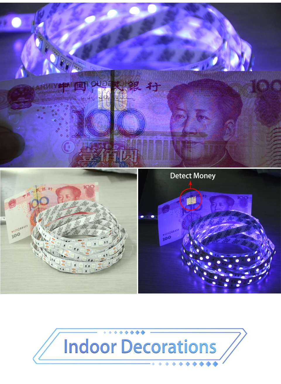 - > Uv dc 12v 5m tira de luz led ultravioleta 385-400nm luz preta 2835 smd lâmpada uv fita led flexível para festa de fluorescência brilhante