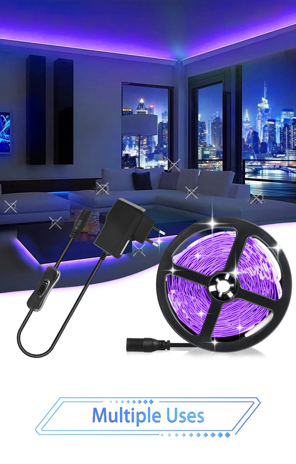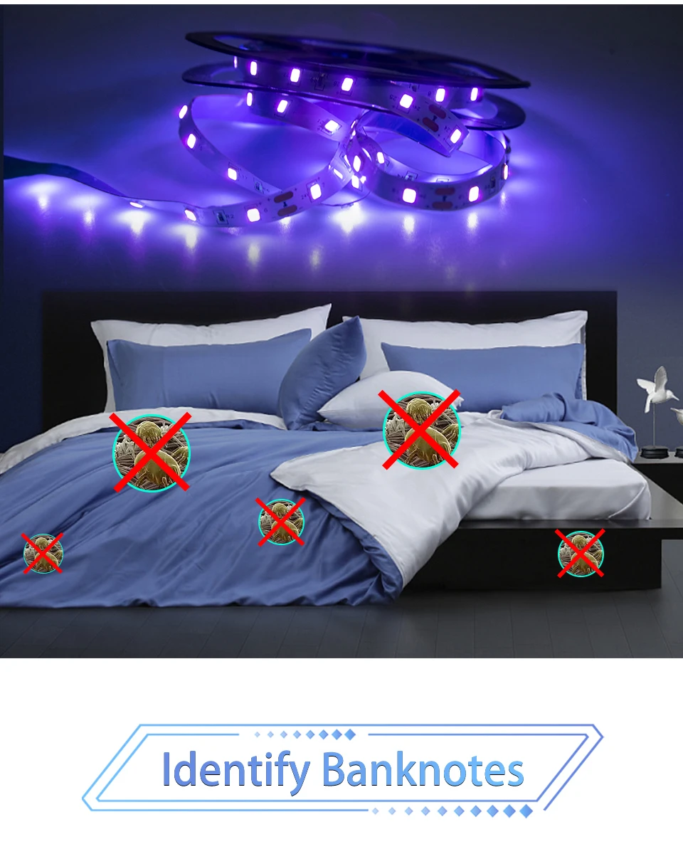 LUZES PRETAS PODEROSAS: Faixa de luz preta UV com qualidade premium e 150 unidades de LEDs ultravioleta (50.000 horas de longa vida, alta eficiência de energia).