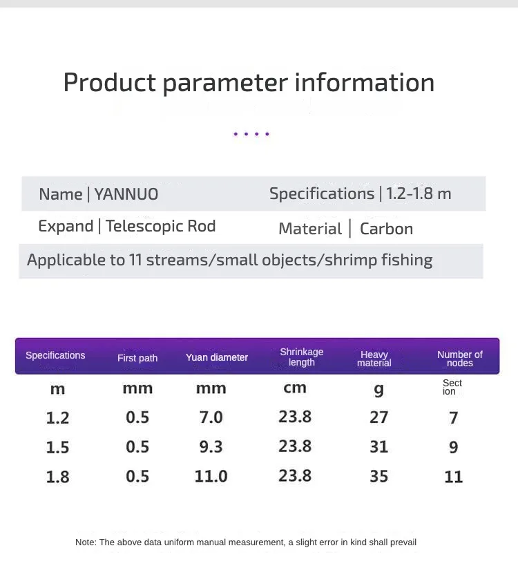 1,2 m: Primeiro diâmetro 0,5 mm, diâmetro Yuan 7,0 mm, comprimento 23,8 cm após contração, peso 27 G, 7 seções