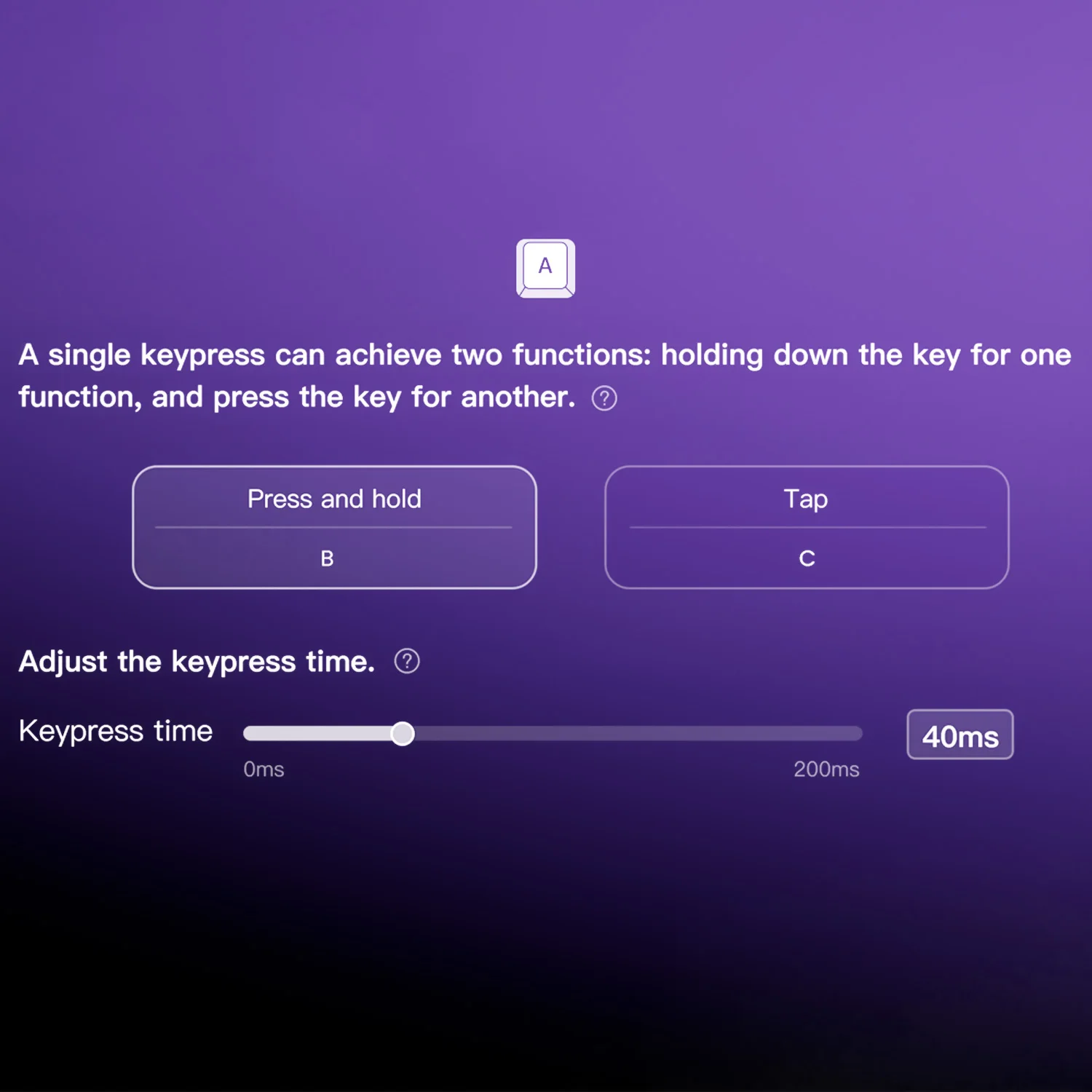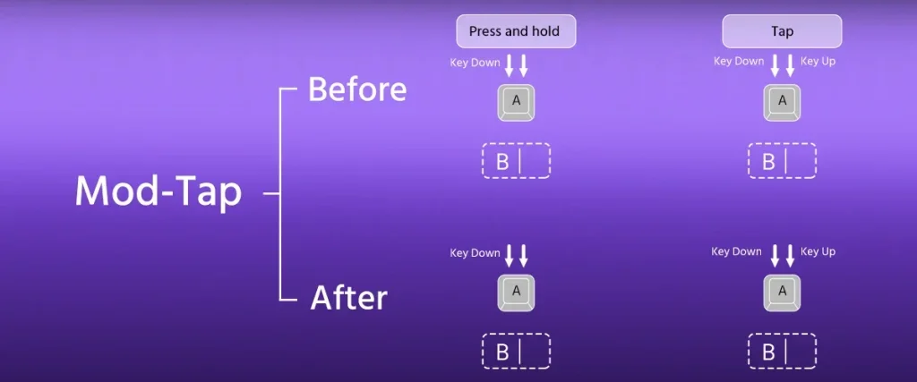 uma chave Mod-Tap Mod Tap em Shine60 é um design que oferece conveniência para jogos.Isso permite a criação de dedicados ou teclas duplas funcionais.Um único toque de tecla pode atingir duas funções: segurando desça a tecla para uma função e pressione a tecla para outra. |