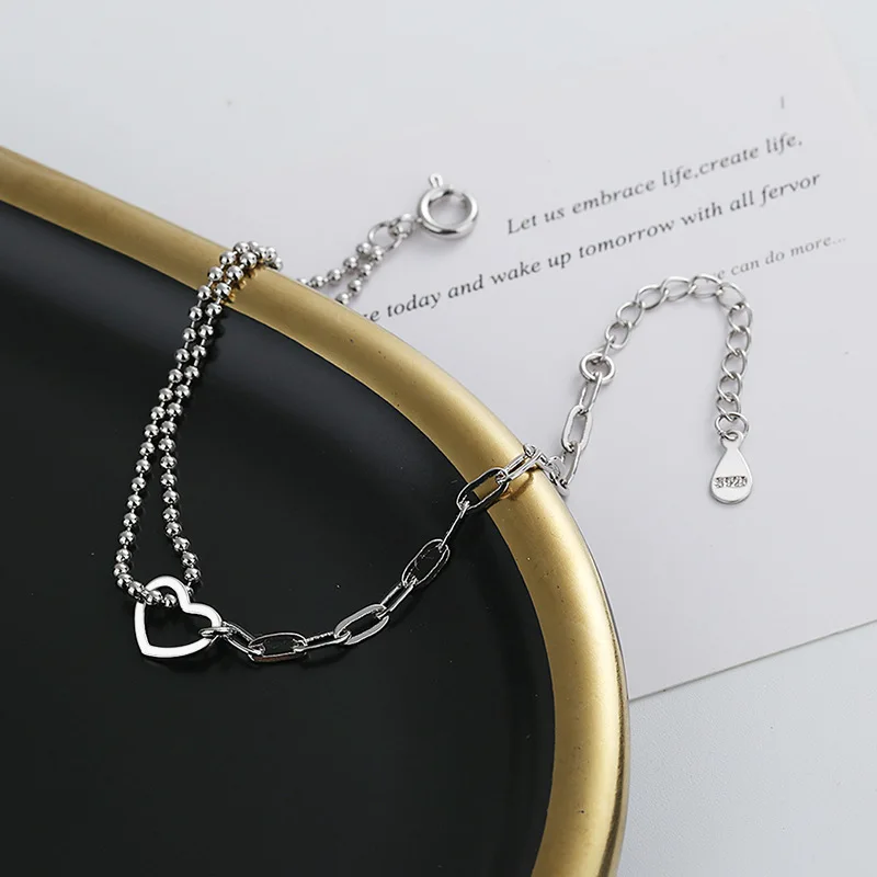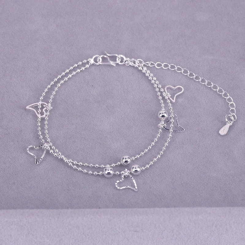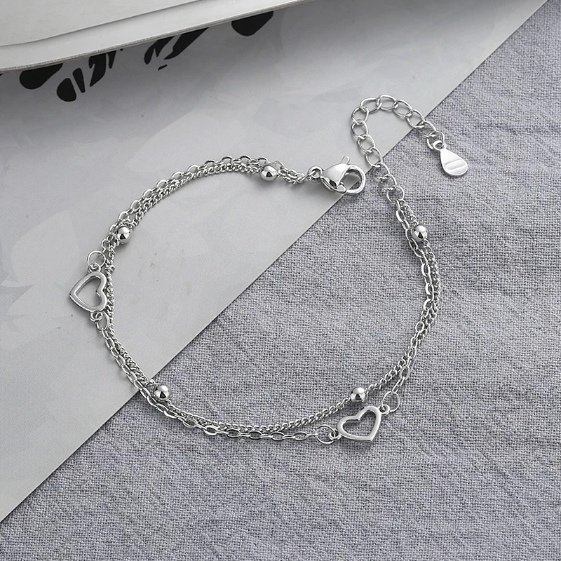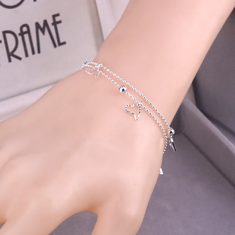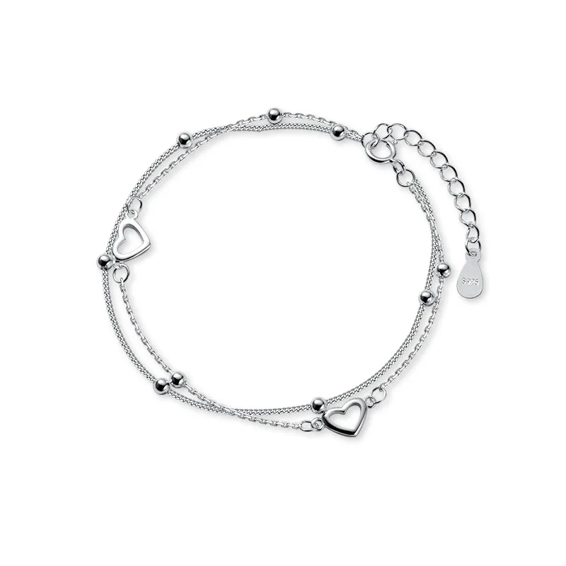 - > Ventfille 925 prata esterlina duplo amor coração oco contas redondas pulseira moda feminina jóias românticas clássico ajustável