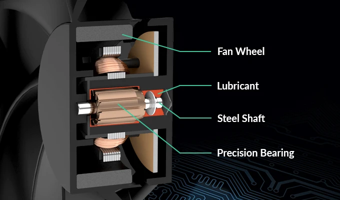 O Fluid Dynamic Bearing vem com uma cápsula de óleo que evita vazamento de lubrificante.Assim, este rolamento é tão silencioso quanto um rolamento de luva, mas tem uma vida útil significativamente maior.