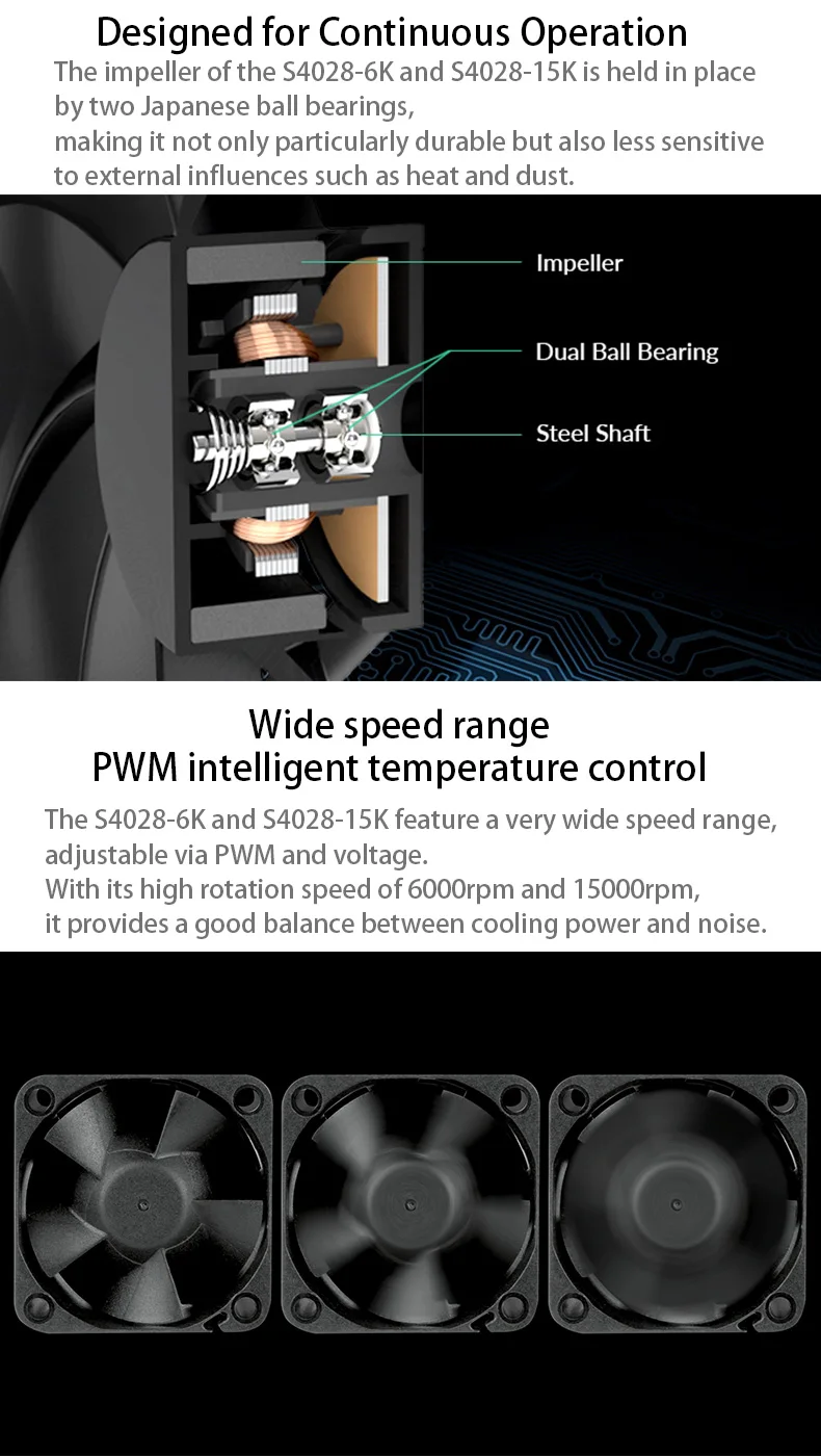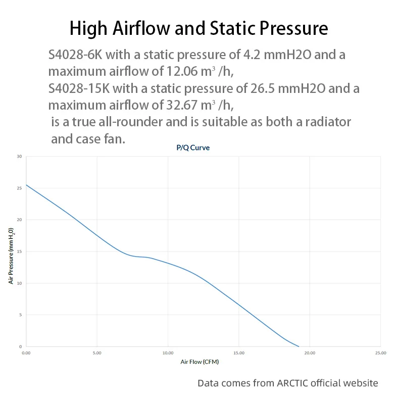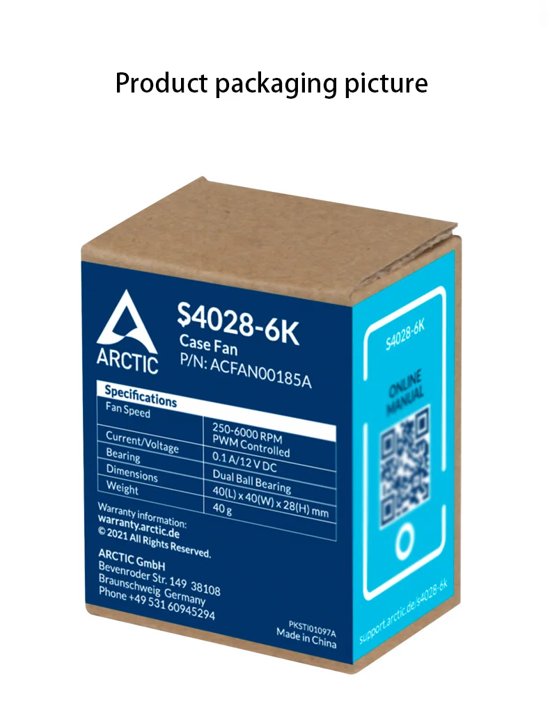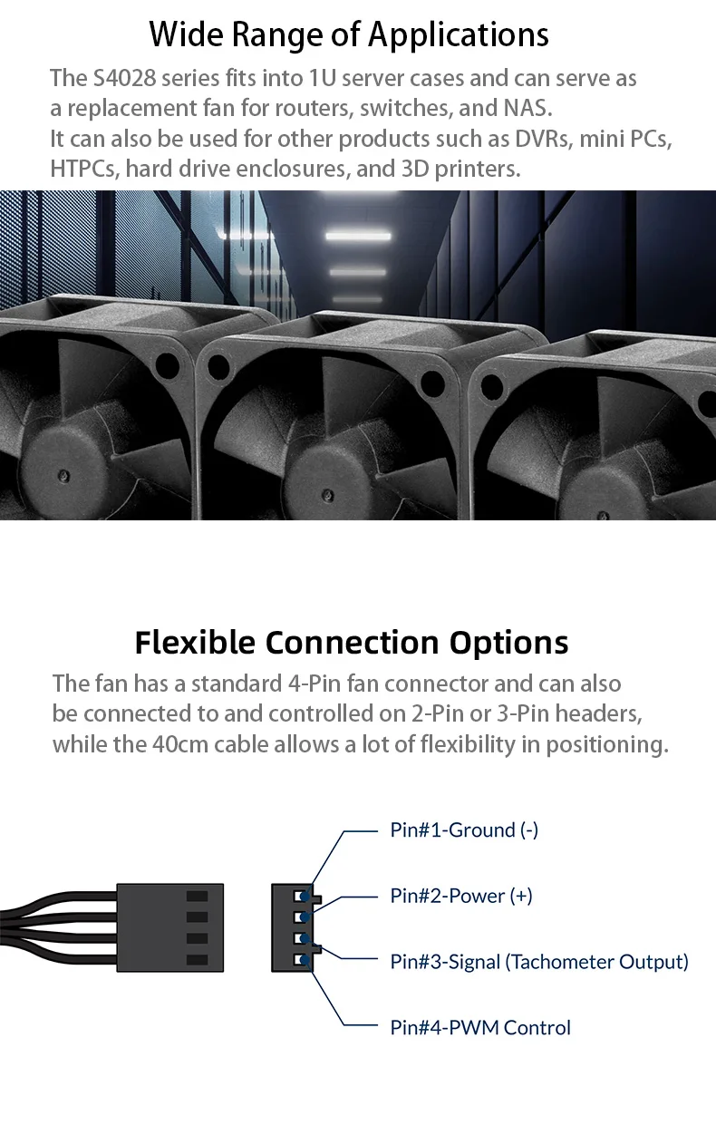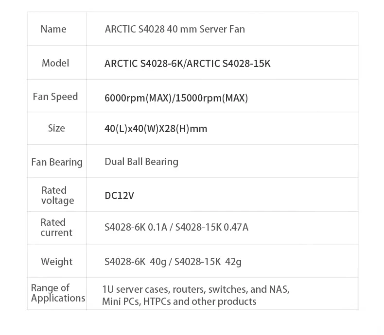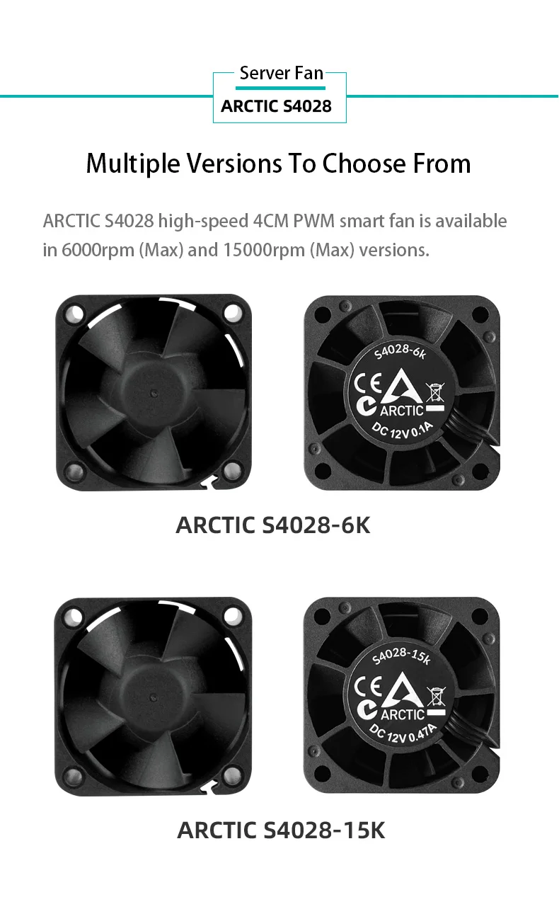 - > Ventilador de servidor ARCTIC S4028 40x40x28mm com rolamento de esferas duplo, 6000/15000 RPM, regulado por PWM, conector de 4 pinos 12 V DC preto