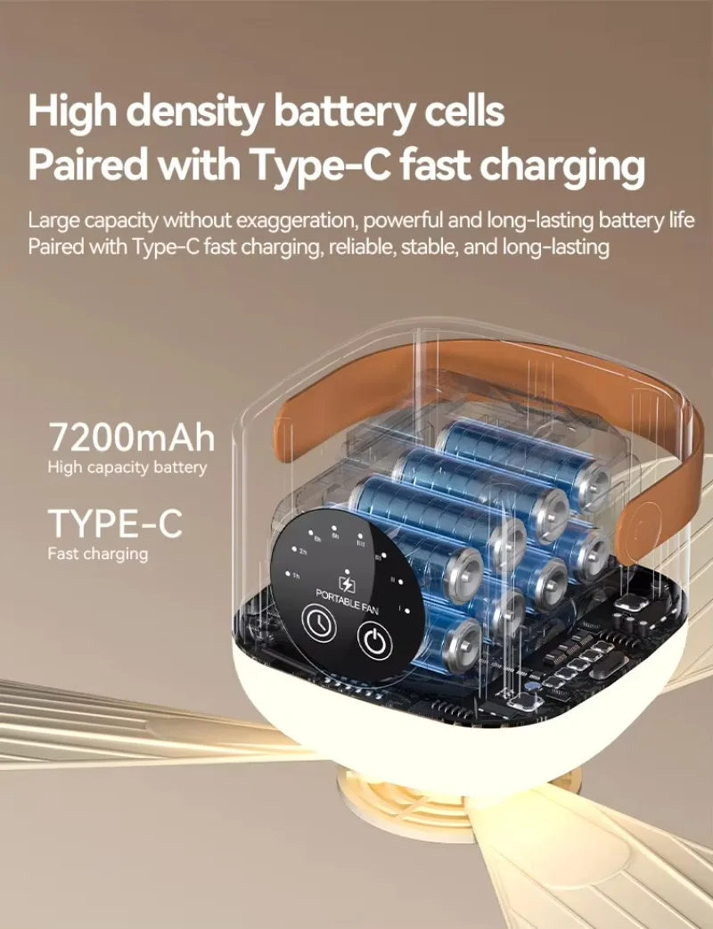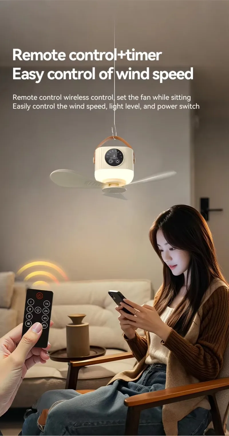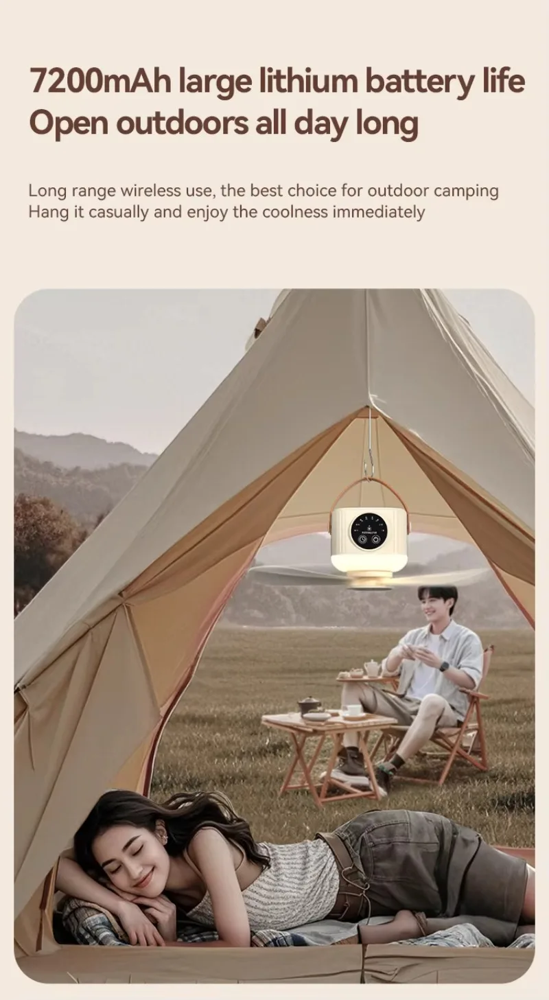 Isto ventilador suspenso portátilé perfeito para estudantes, acampar, e atividades ao ar livre.Possui um bateria grande de 7200mAh, proporcionando energia de resfriamento de longa duração.O Carregamento USBrecurso garante fácil recarga, enquanto o controle remotopermite ajustes convenientes.O ventilador foi projetado com um design suspenso, tornando-o perfeito para espaços pequenos como dormitórios ou ao ar livre.Com um Porta de carregamento tipo C, garante um carregamento rápido e eficiente, e seu operação silenciosaproporciona uma atmosfera tranquila e relaxante.