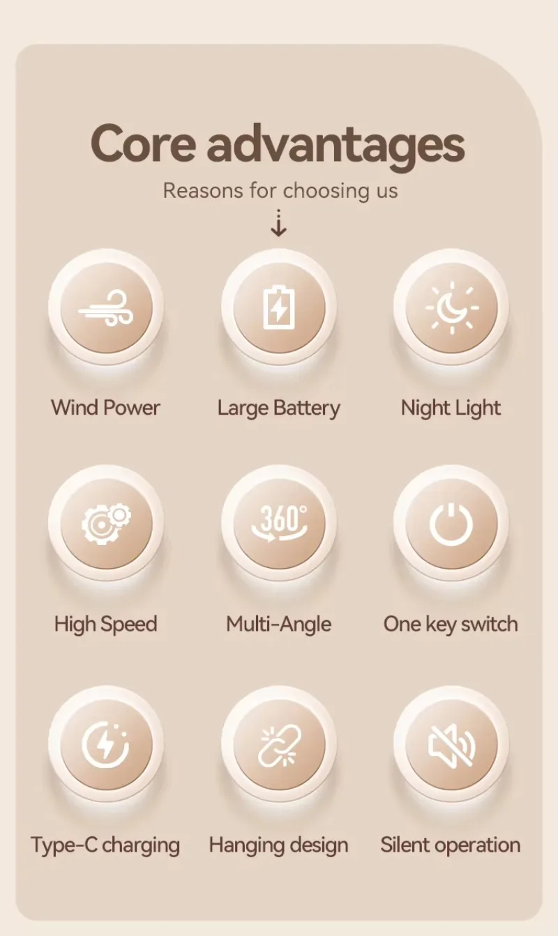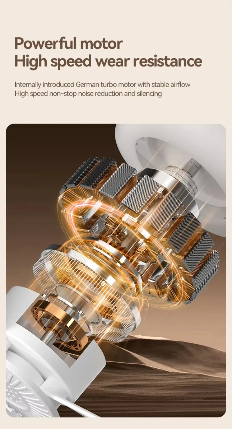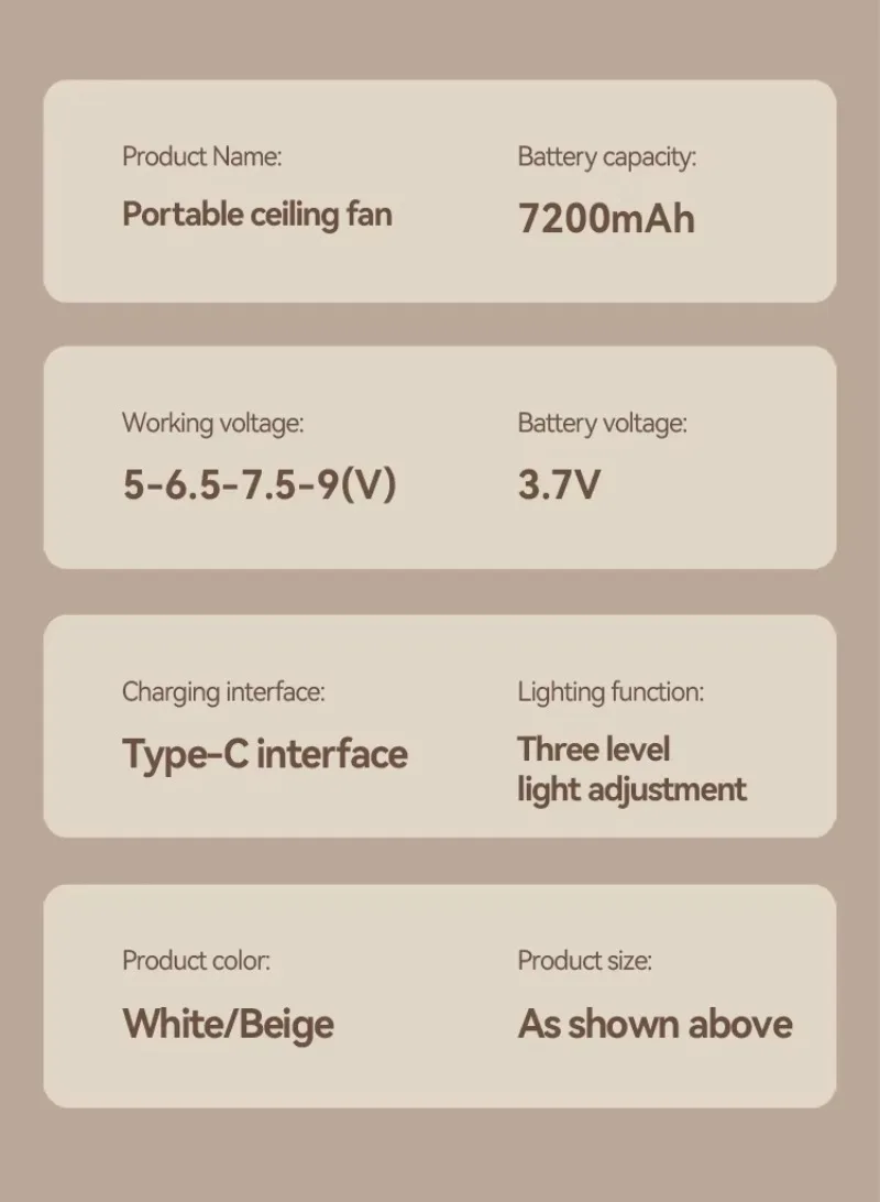 Isto ventilador suspenso portátilé perfeito para estudantes, acampar, e atividades ao ar livre.Possui um bateria grande de 7200mAh, proporcionando energia de resfriamento de longa duração.O Carregamento USBrecurso garante fácil recarga, enquanto o controle remotopermite ajustes convenientes.O ventilador foi projetado com um design suspenso, tornando-o perfeito para espaços pequenos como dormitórios ou ao ar livre.Com um Porta de carregamento tipo C, garante um carregamento rápido e eficiente, e seu operação silenciosaproporciona uma atmosfera tranquila e relaxante.