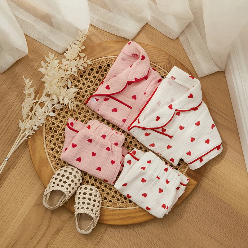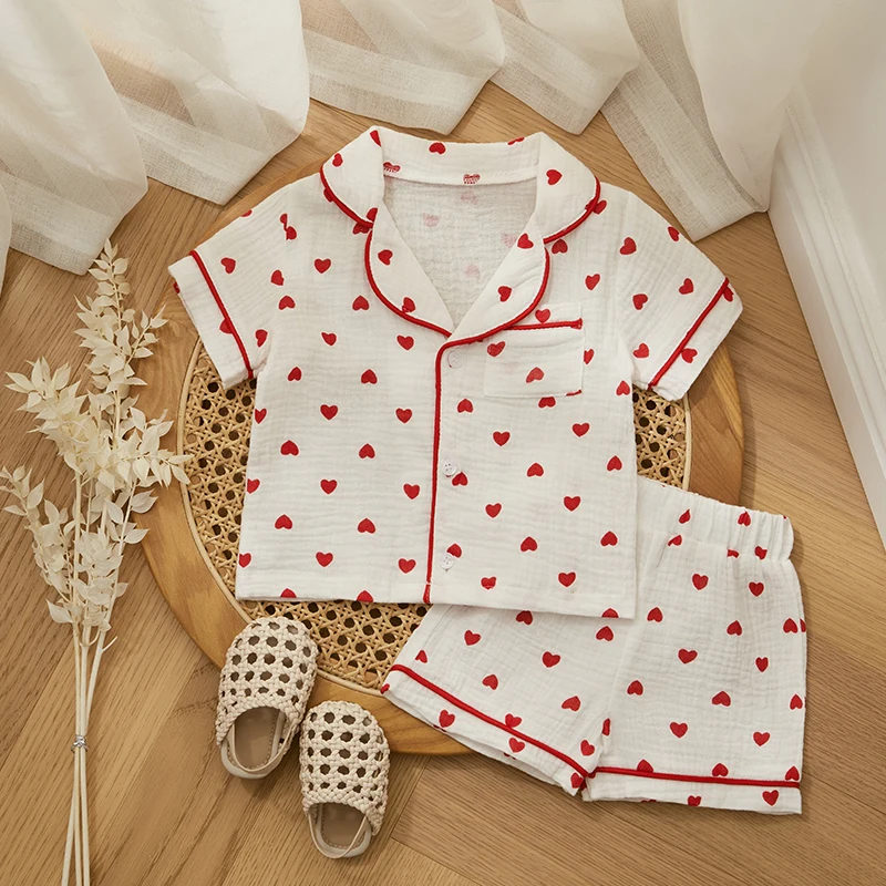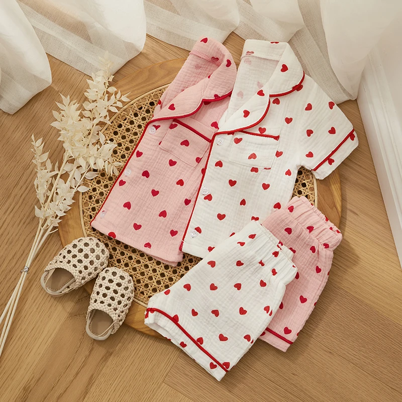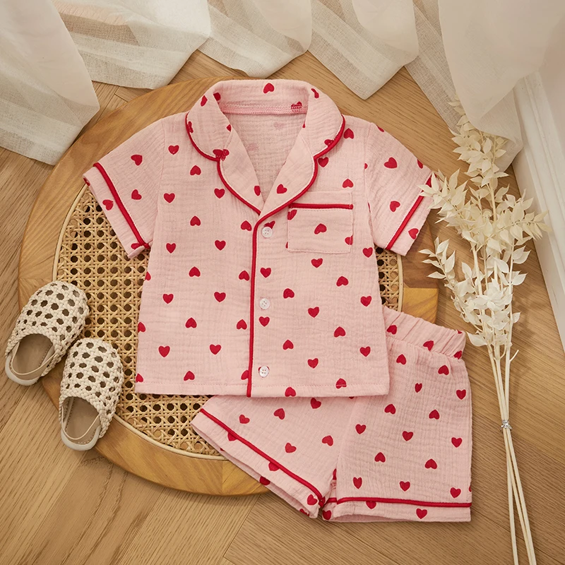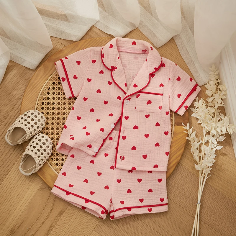- > Verão bebê menina menino conjunto de pijama algodão linho botão para baixo roupas manga curta coração impressão topos shorts crianças loungewear pijamas
