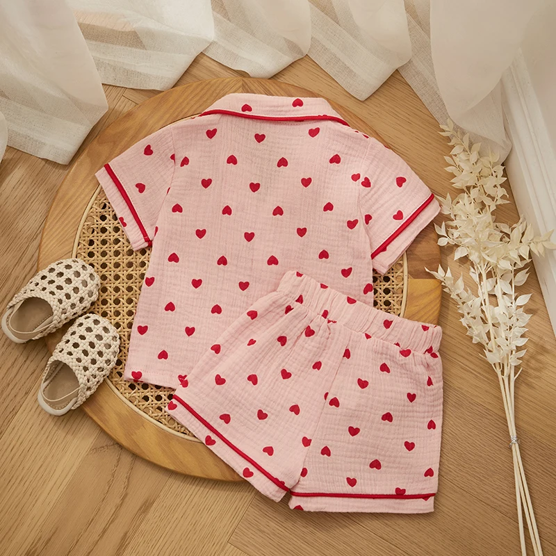 Conjunto de pijama infantil para meninas, gola de lapela, botão, manga curta + cintura elástica, shorts com estampa de coração, 2 peças, roupa de dormir