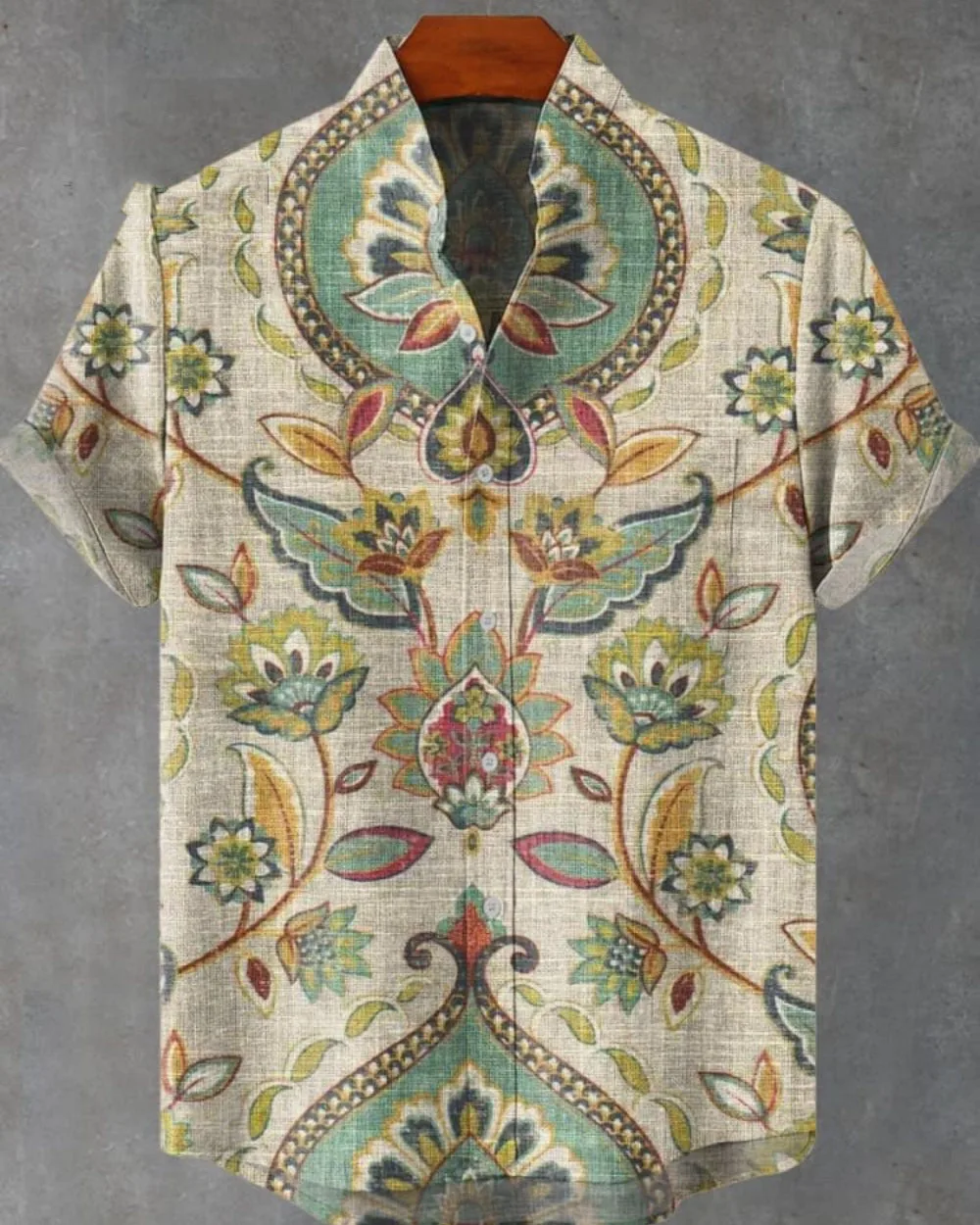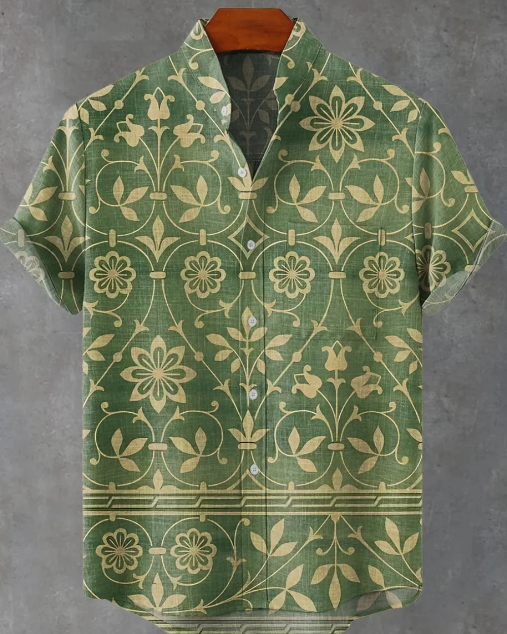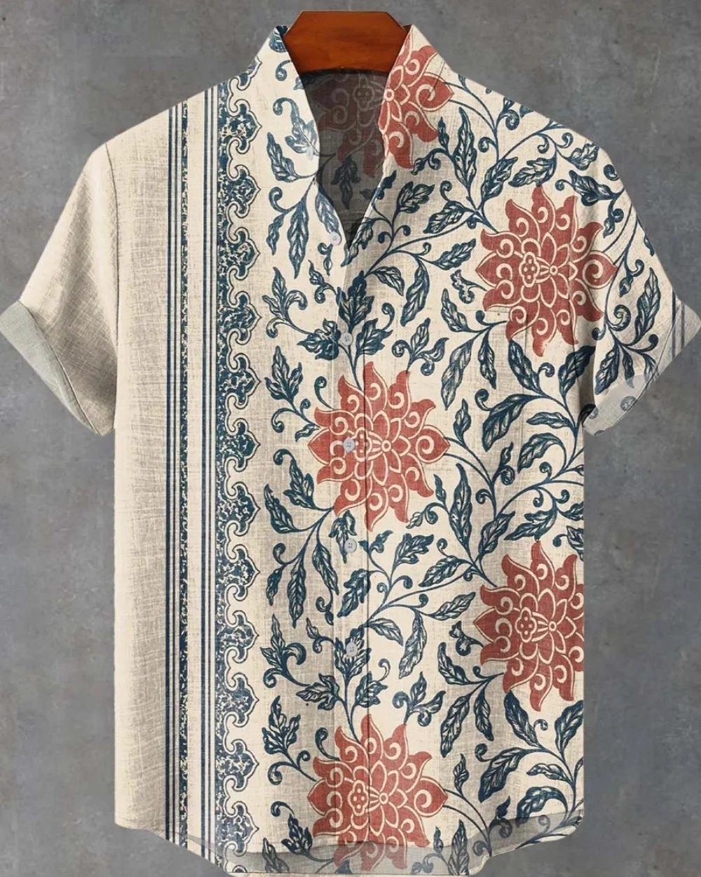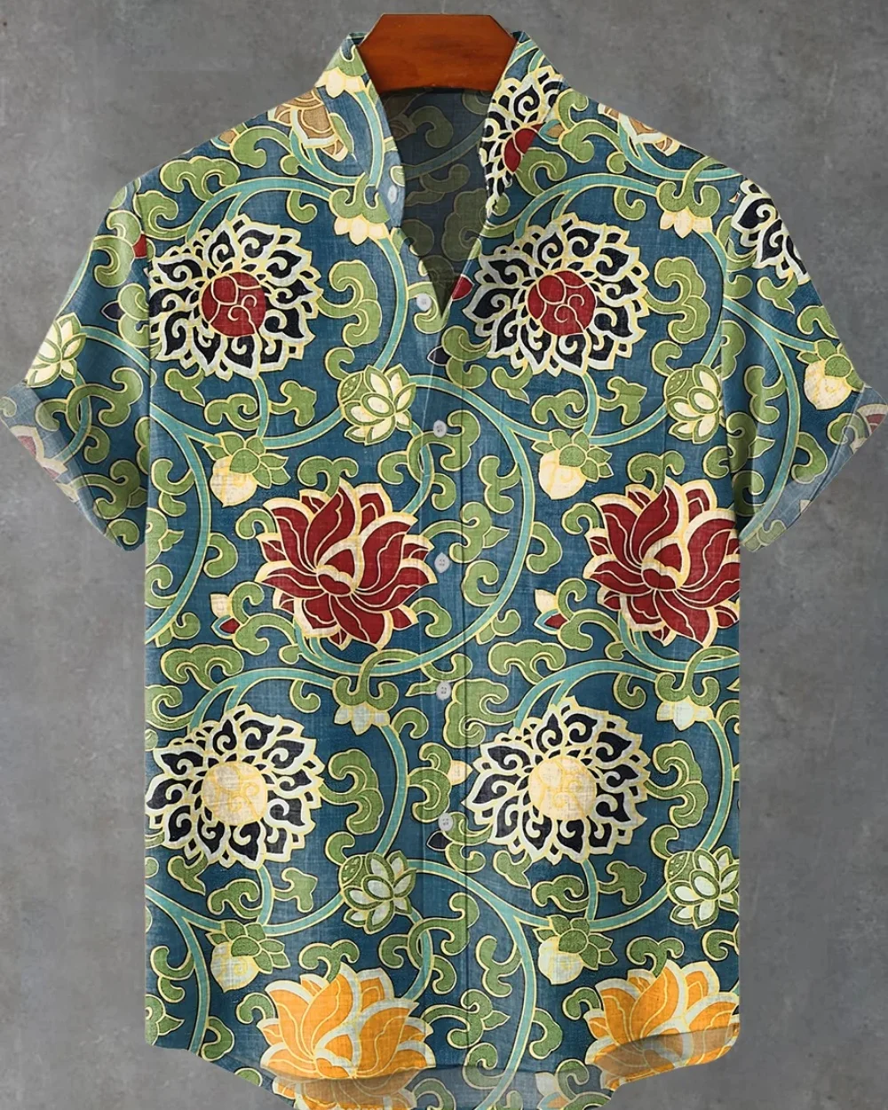 - > Verão masculino elegante arte pétala padrão retro linho camisa de manga curta confortável casual alta qualidade botão topo