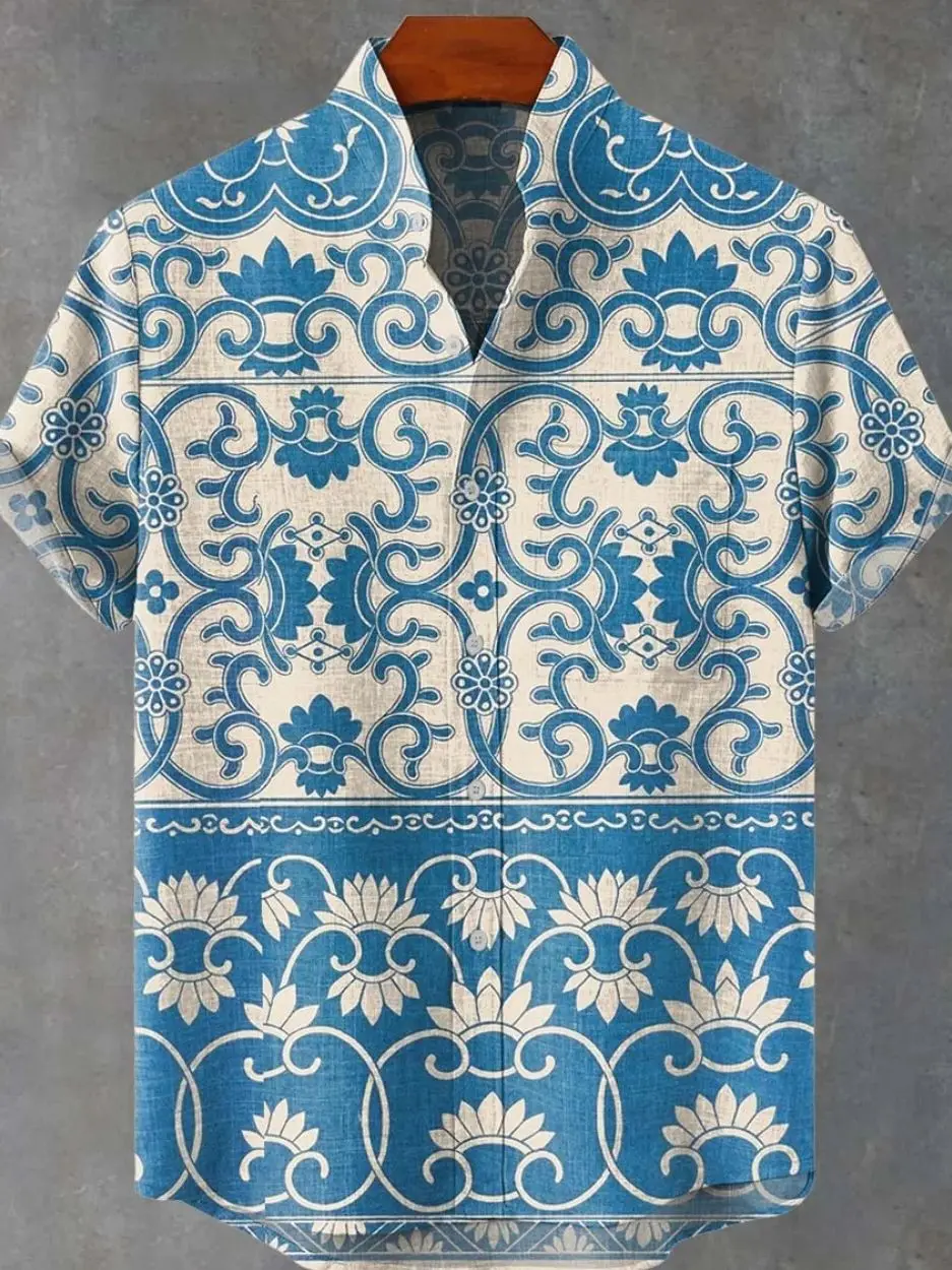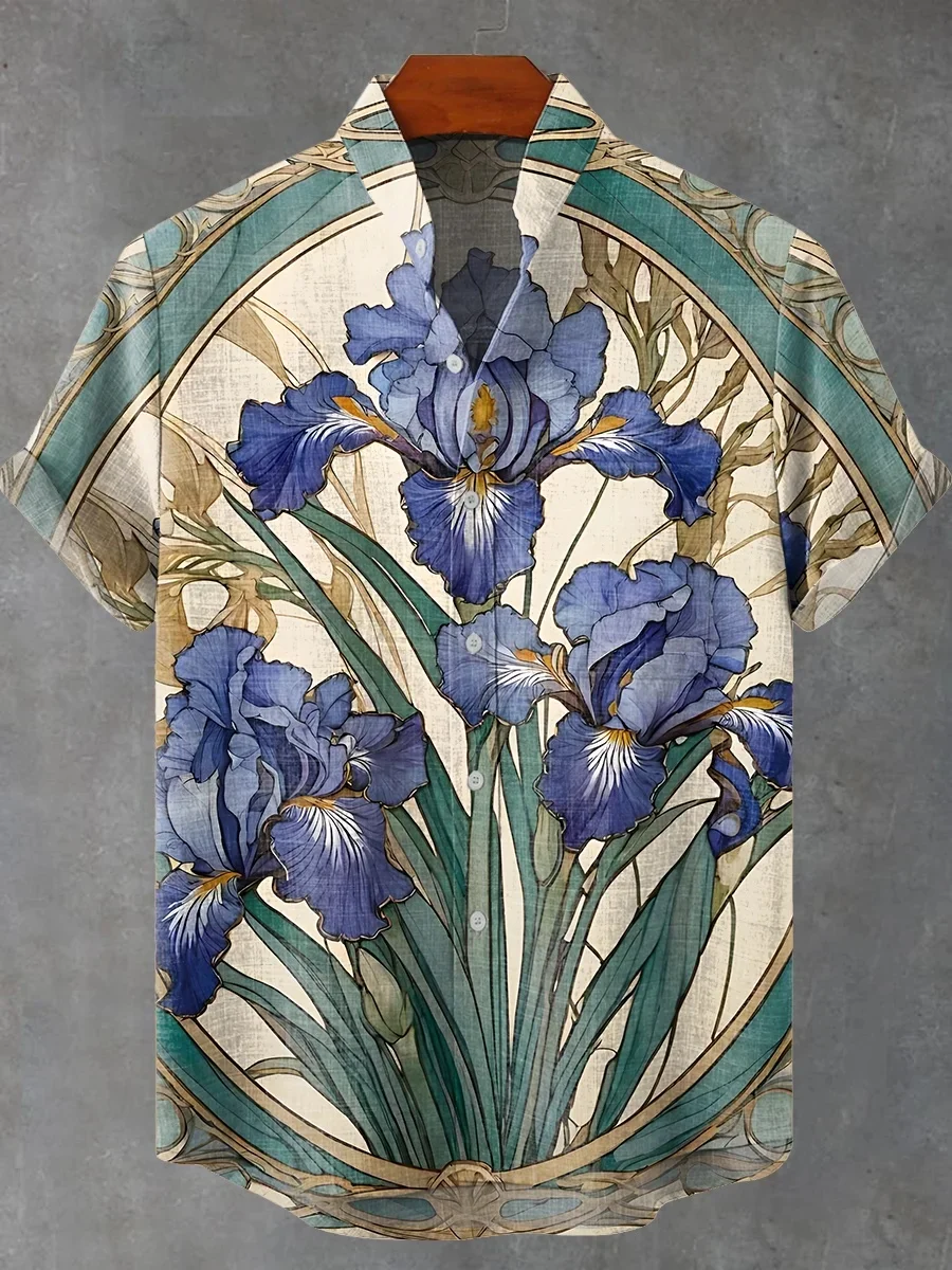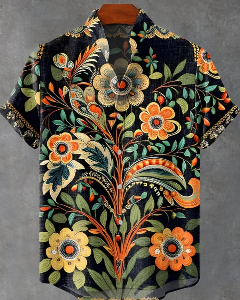 - > Verão masculino elegante arte pétala padrão retro linho camisa de manga curta confortável casual alta qualidade botão topo