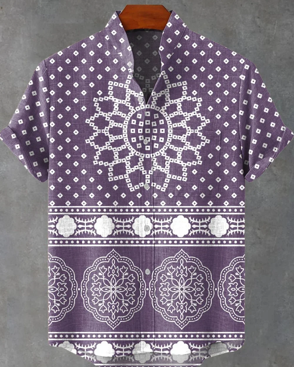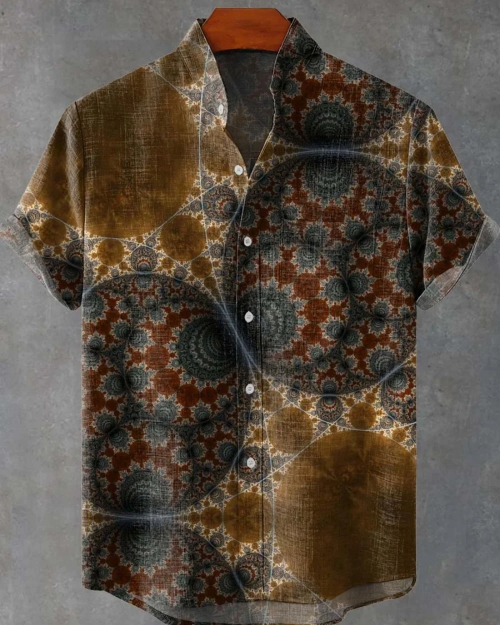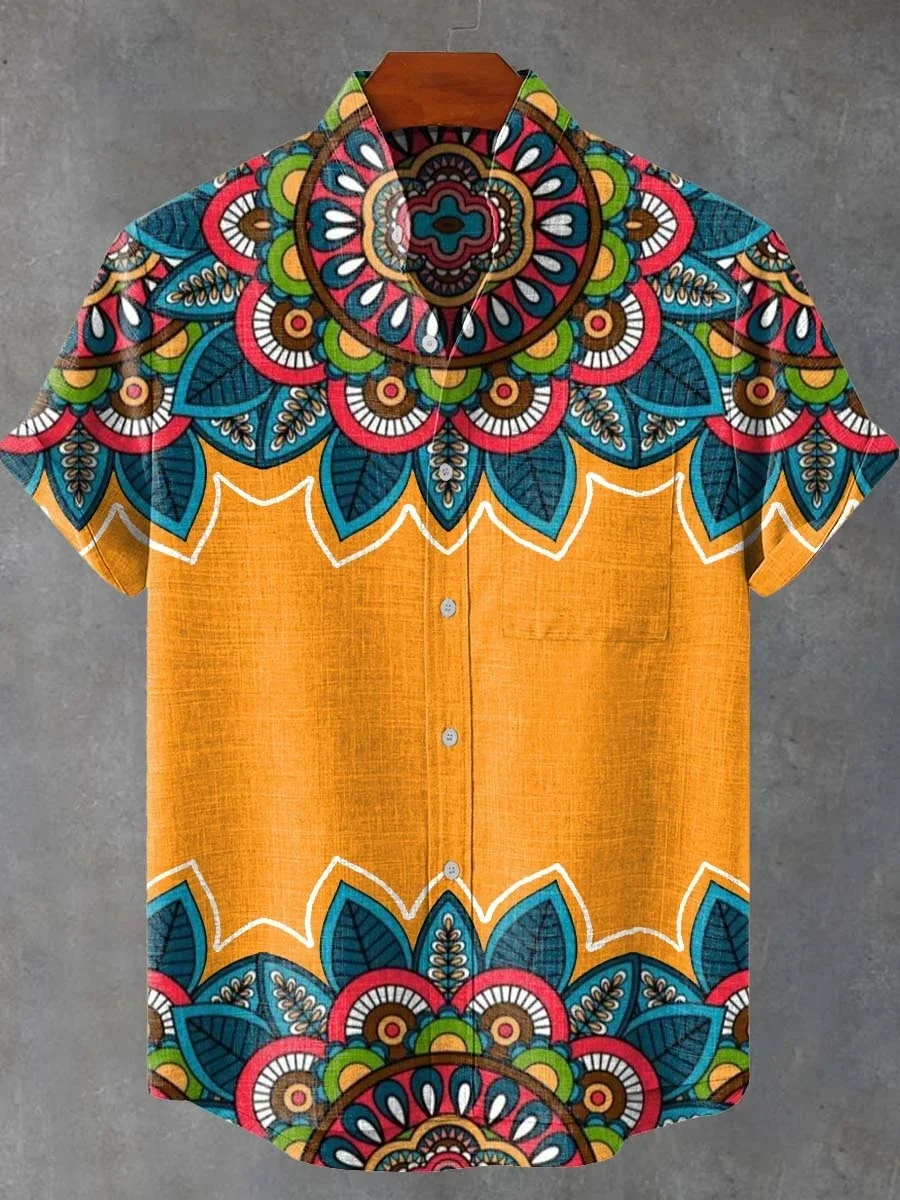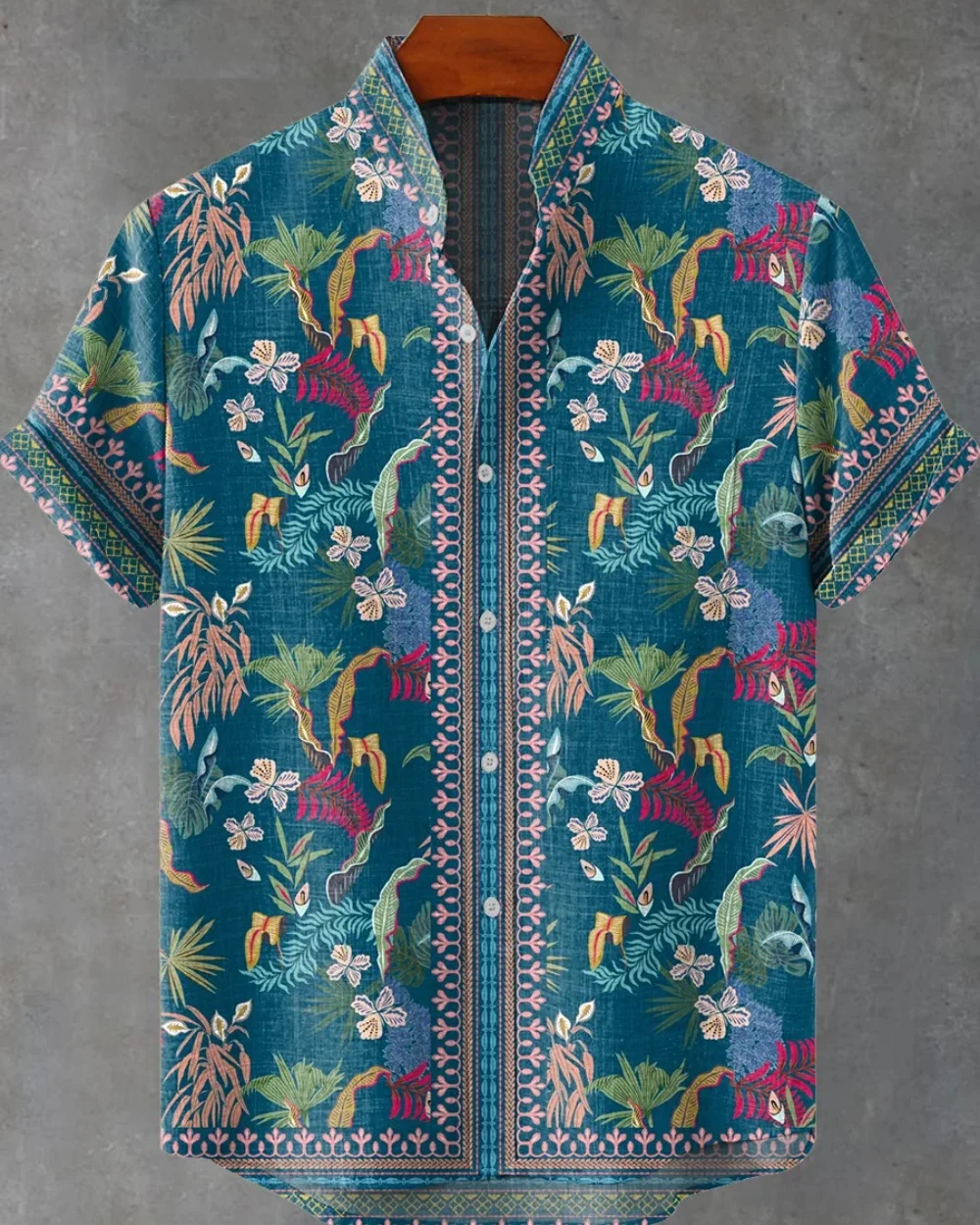 - > Verão masculino elegante arte pétala padrão retro linho camisa de manga curta confortável casual alta qualidade botão topo