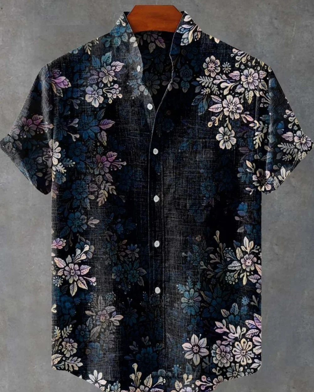 Verão masculino elegante arte pétala padrão retro linho camisa de manga curta confortável casual alta qualidade botão topo
