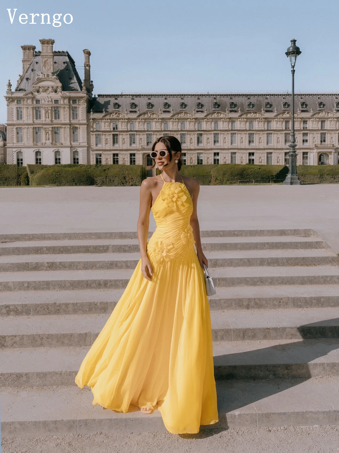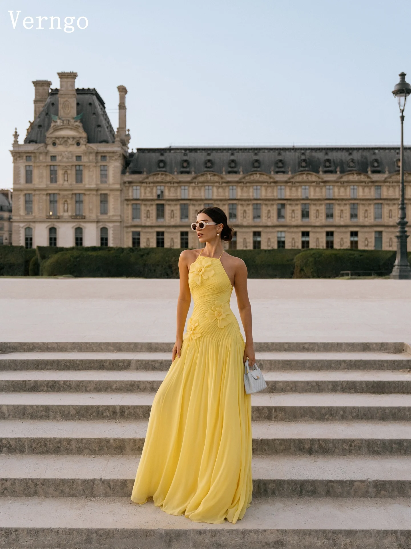 Vestido de noite Verngo em chiffon amarelo, modelo halter, feito à mão, plissado, com apliques, vestido longo para ocasiões formais, personalizado
