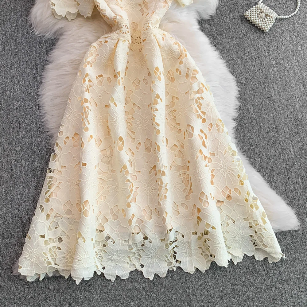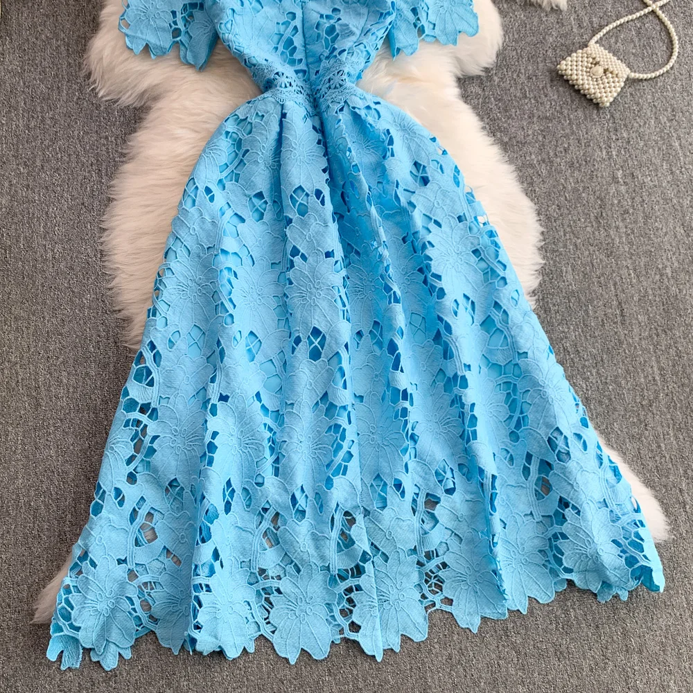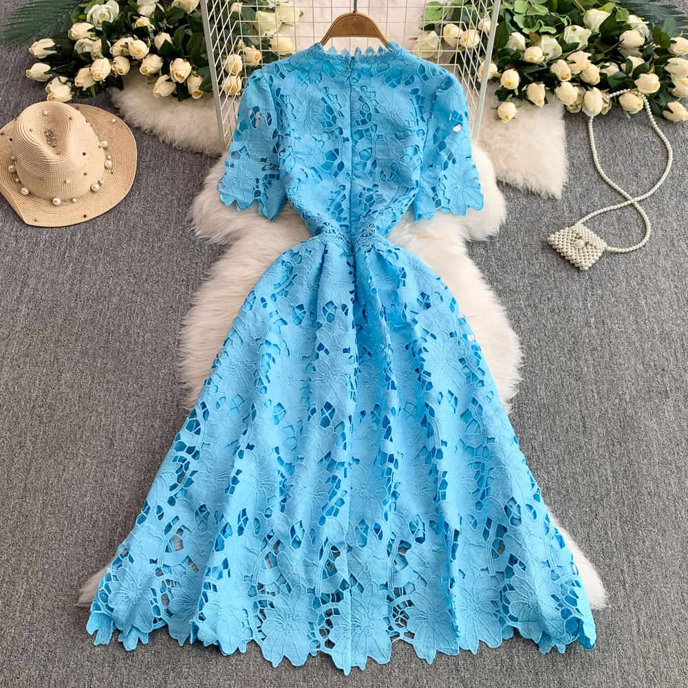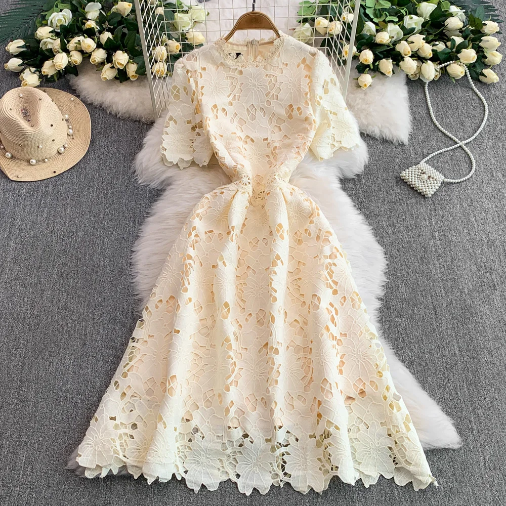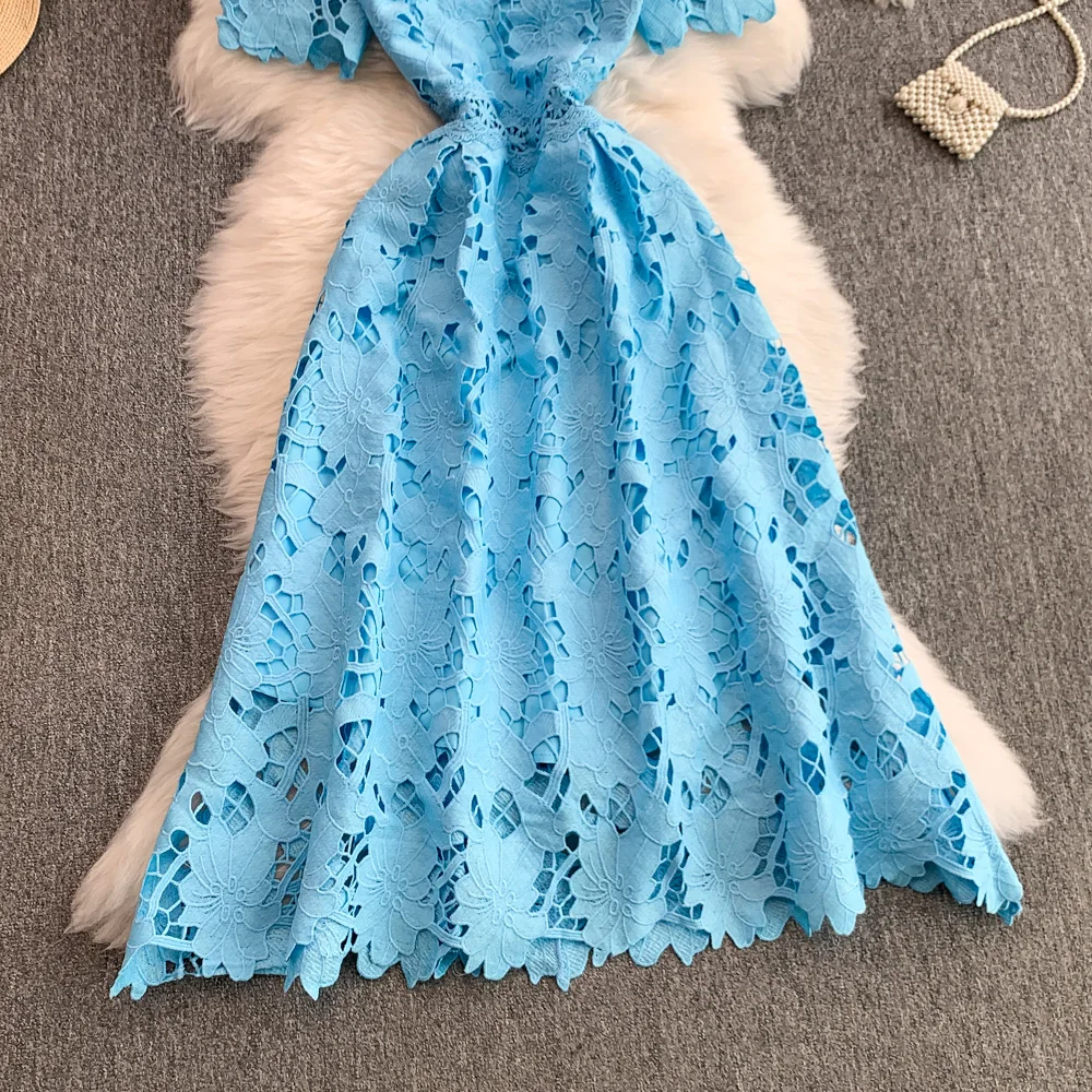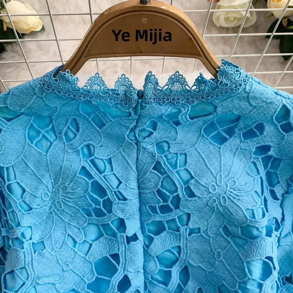 Vestido F E de Verão com Renda e Gola Redonda, Saia Longa de Cintura Alta com Efeito Emaecedor, Estilo Corean...