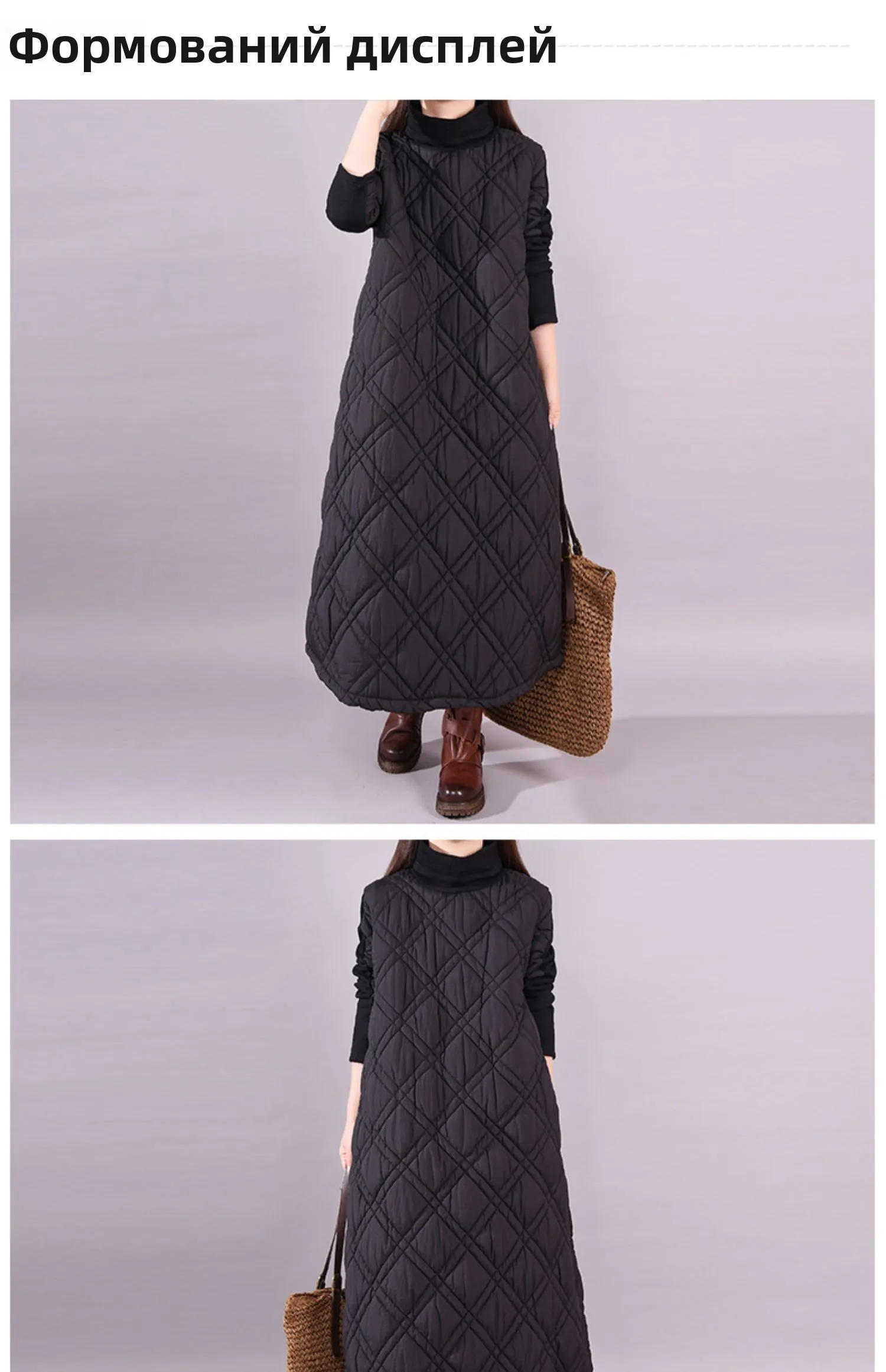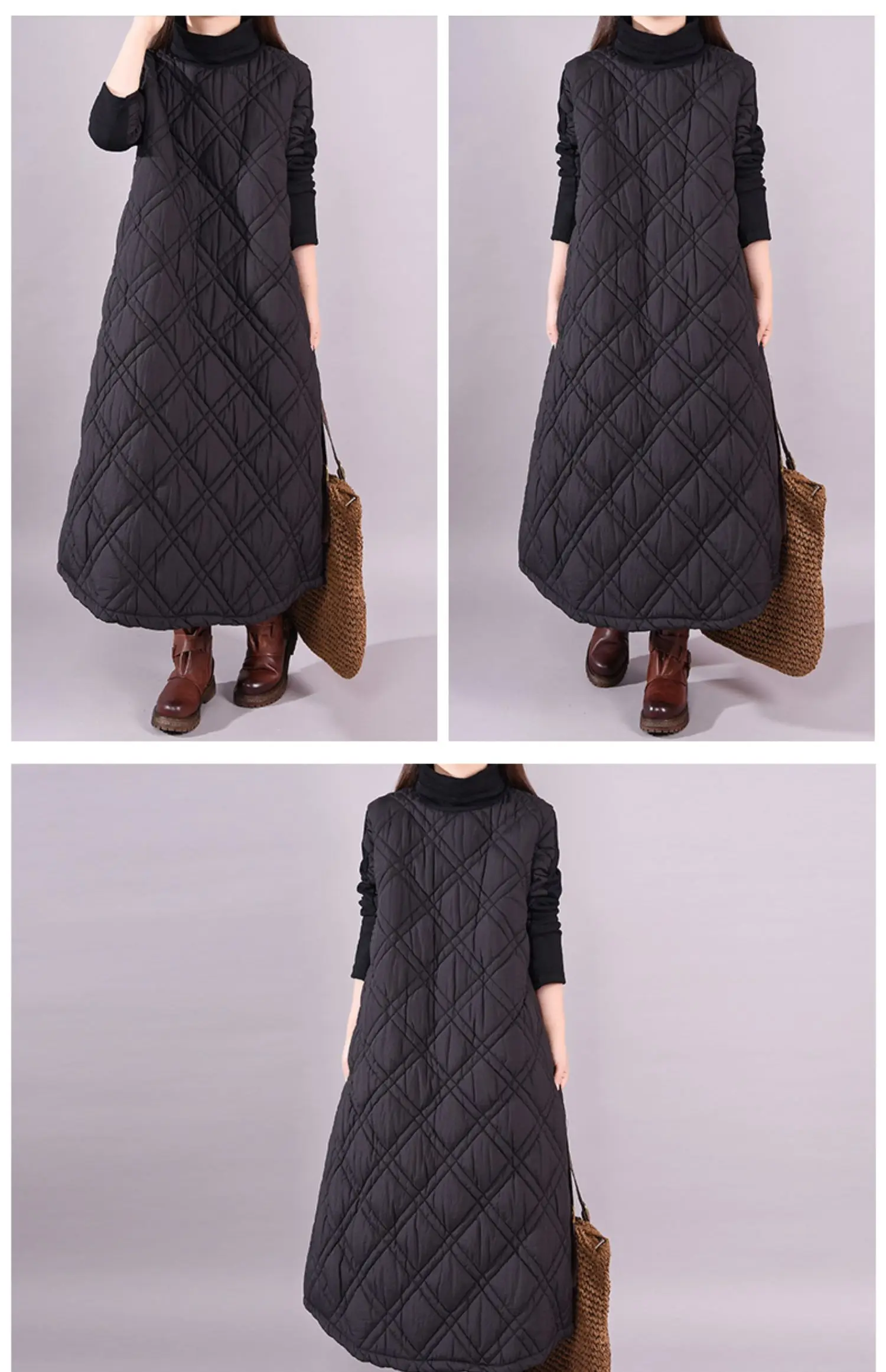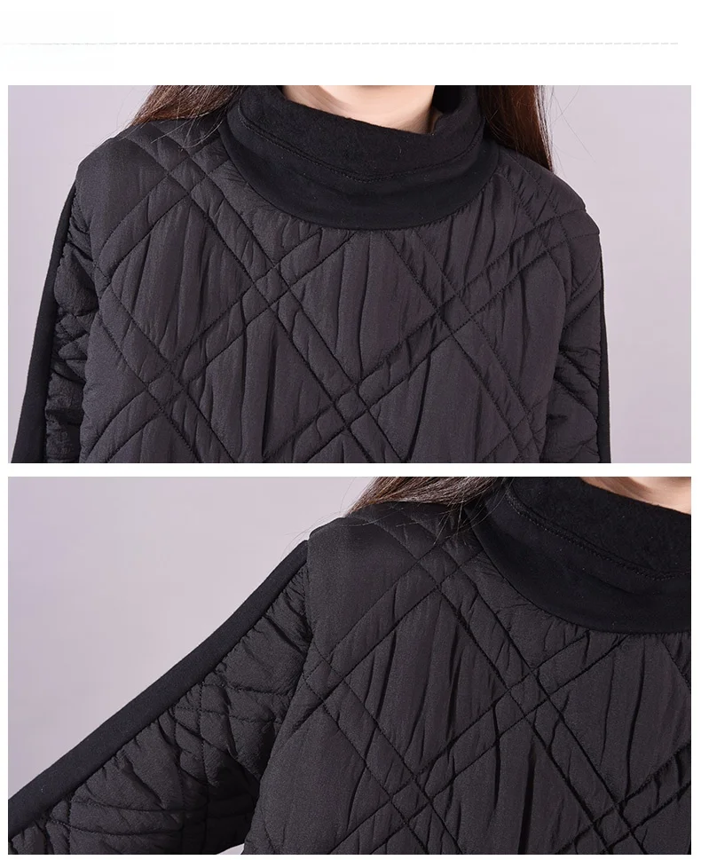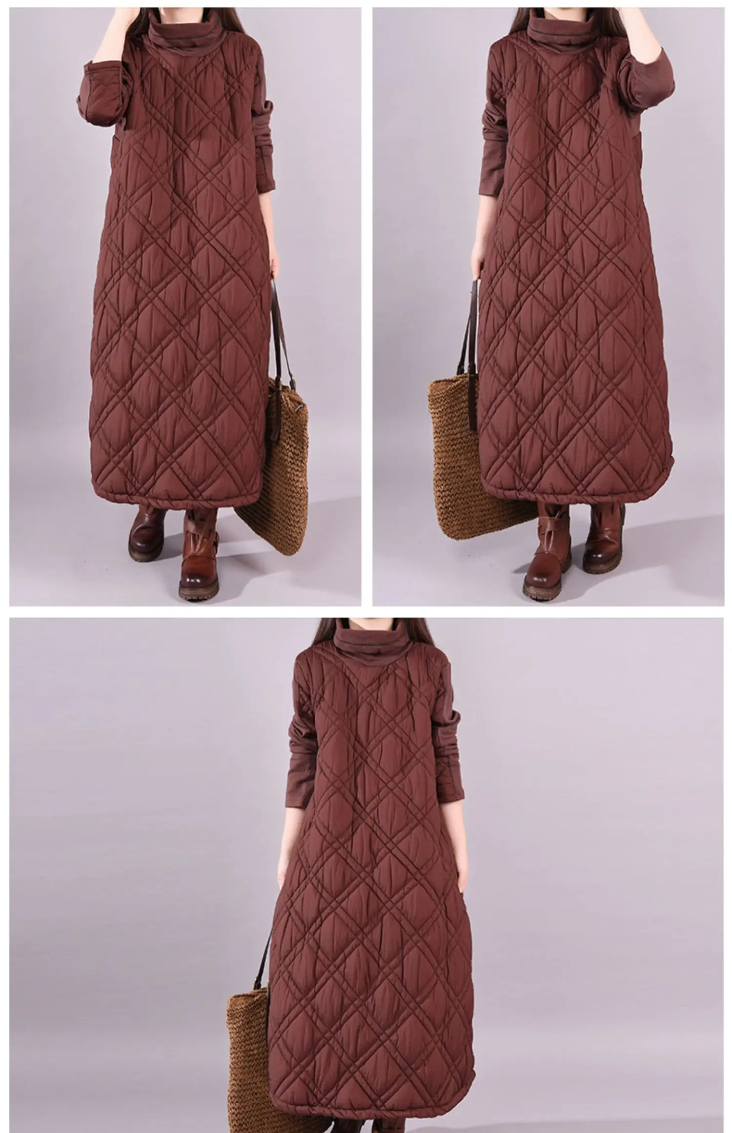 Vestido F sso e Quente de Gola Alta, Solto, Crimento Médio, Acolchoado de Aodão com Padrão Diamante, Estilo In...