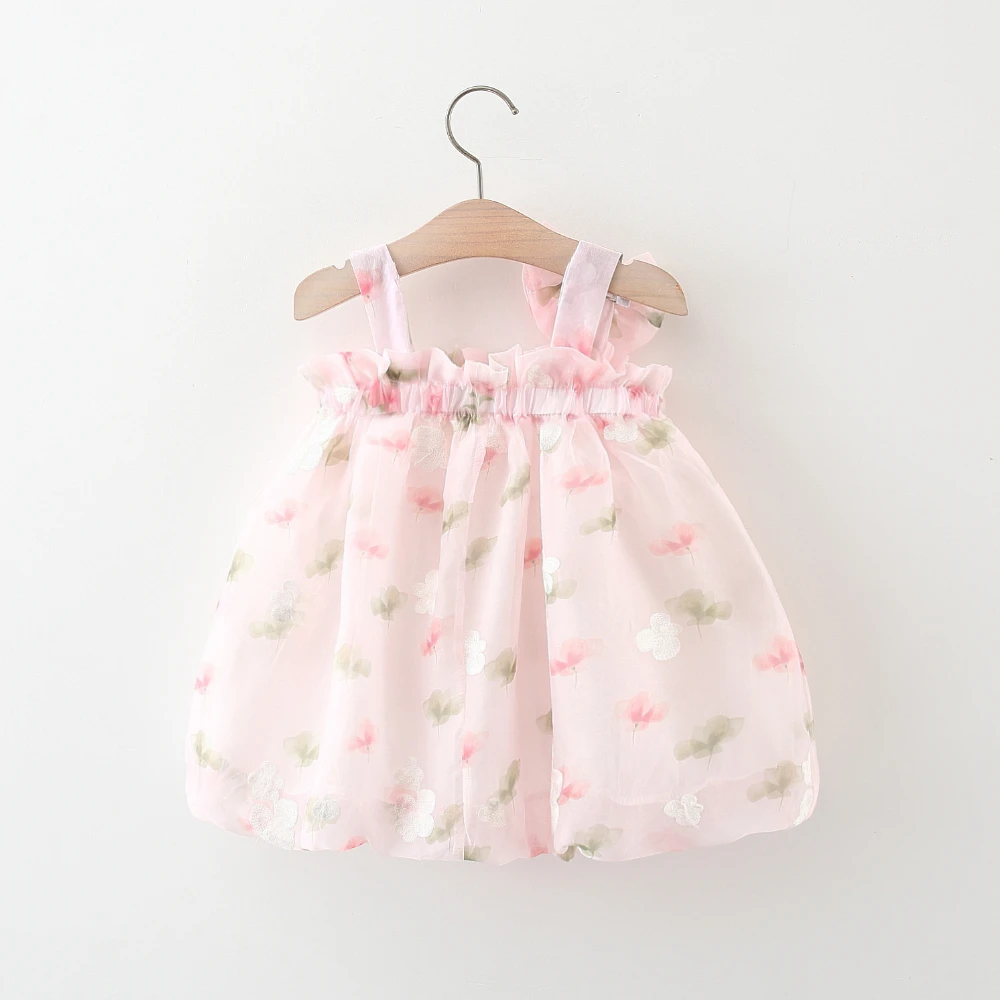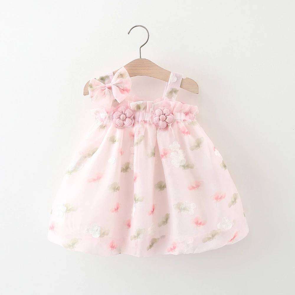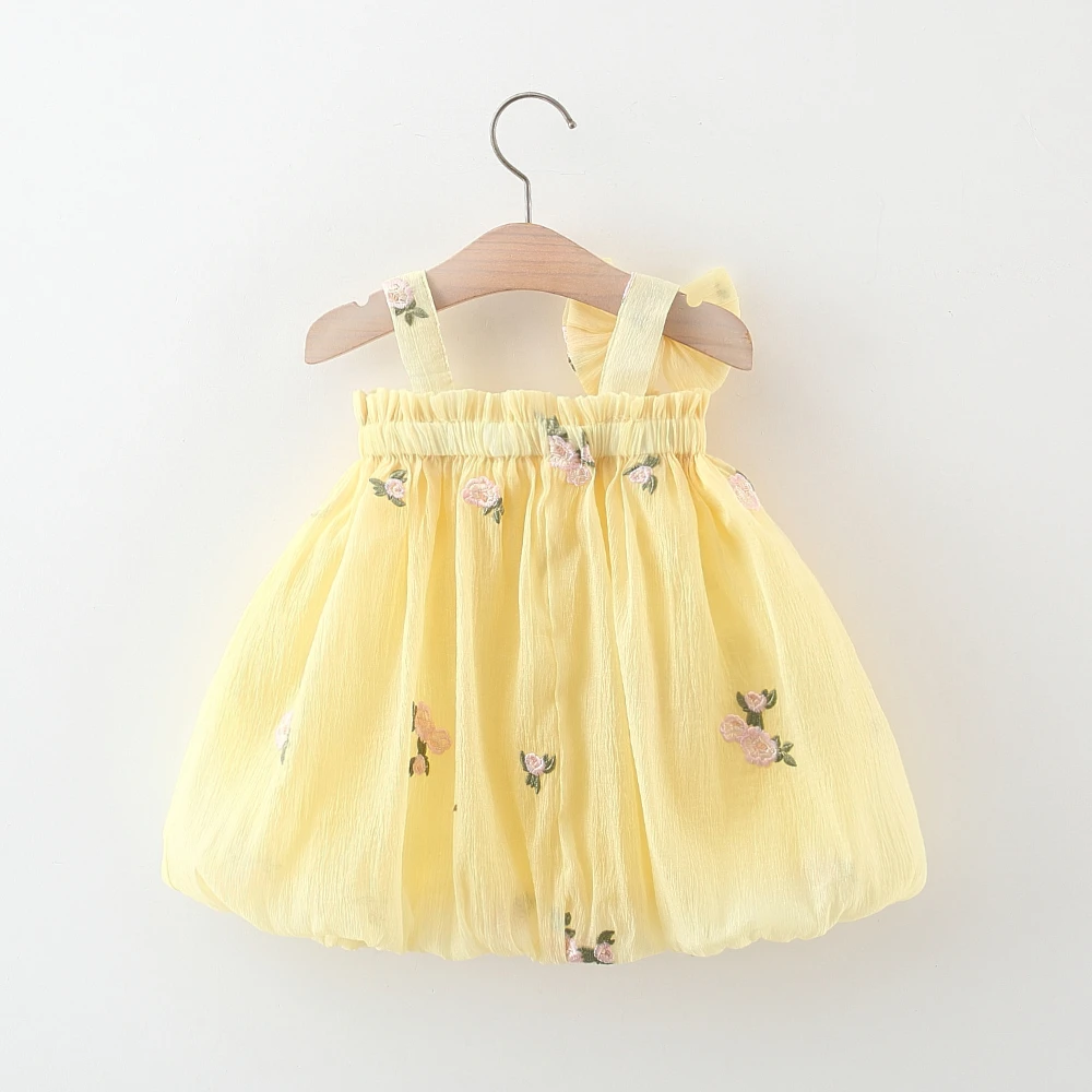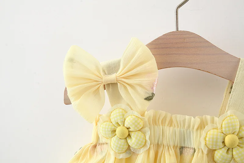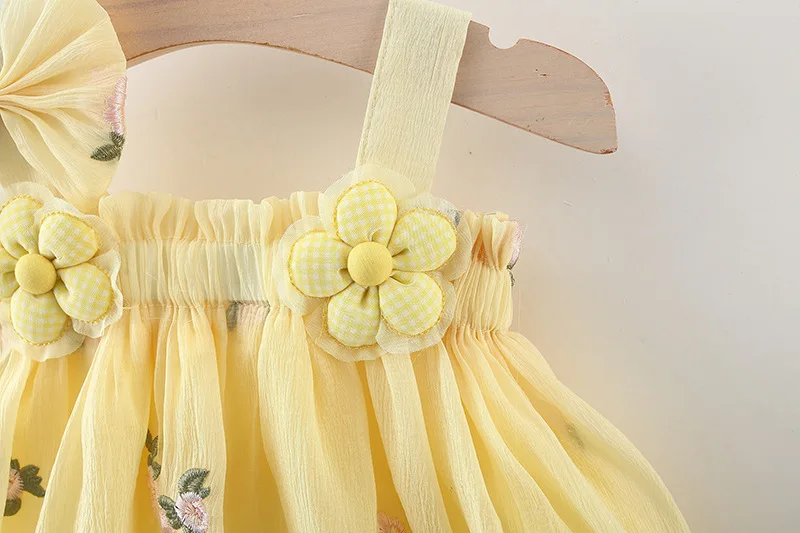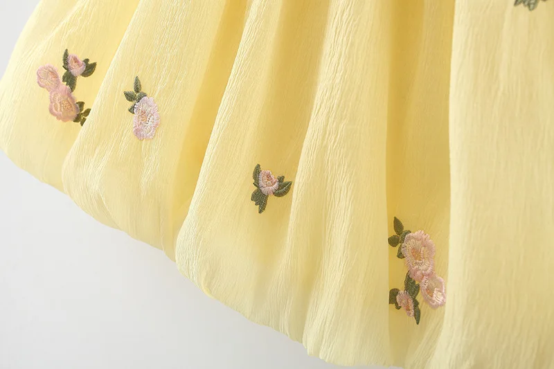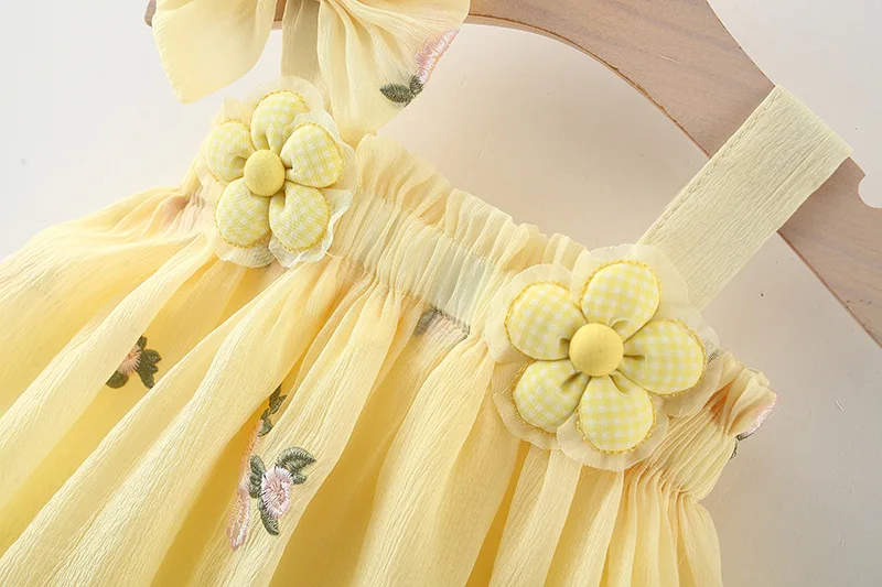 - > Vestido infantil de verão em chiffon com flores bordadas vestido amarelo estilo coreano roupas infantis