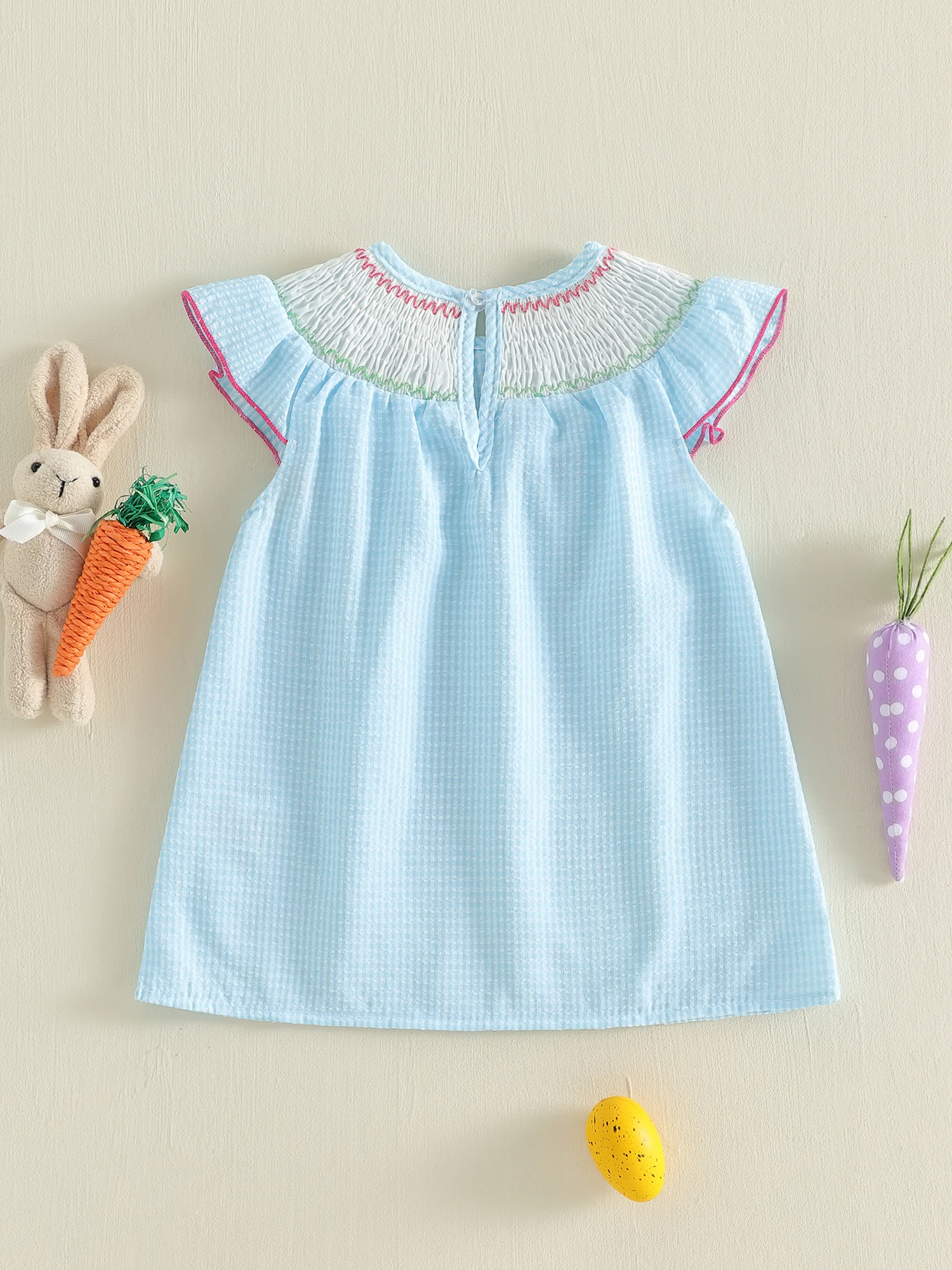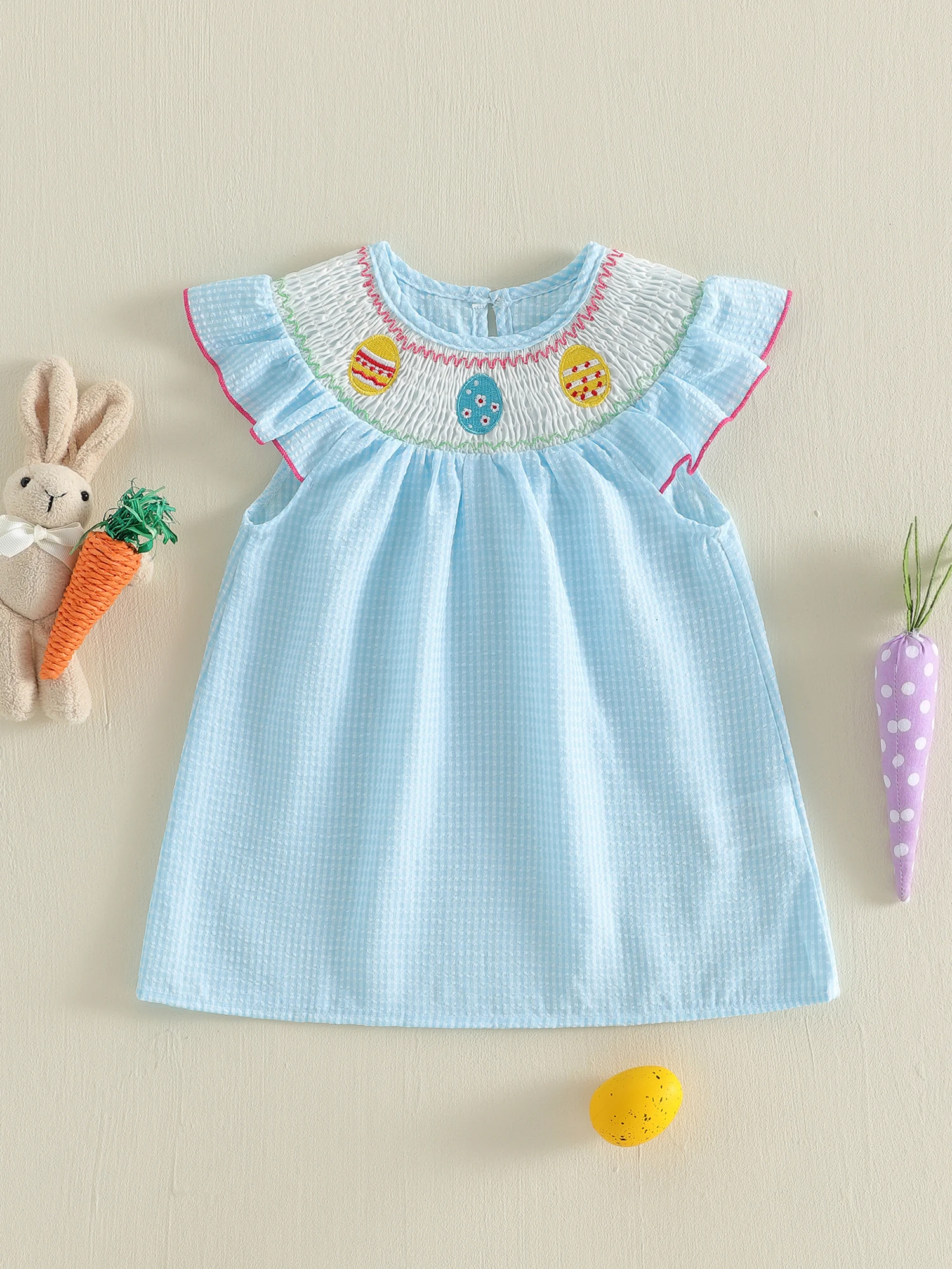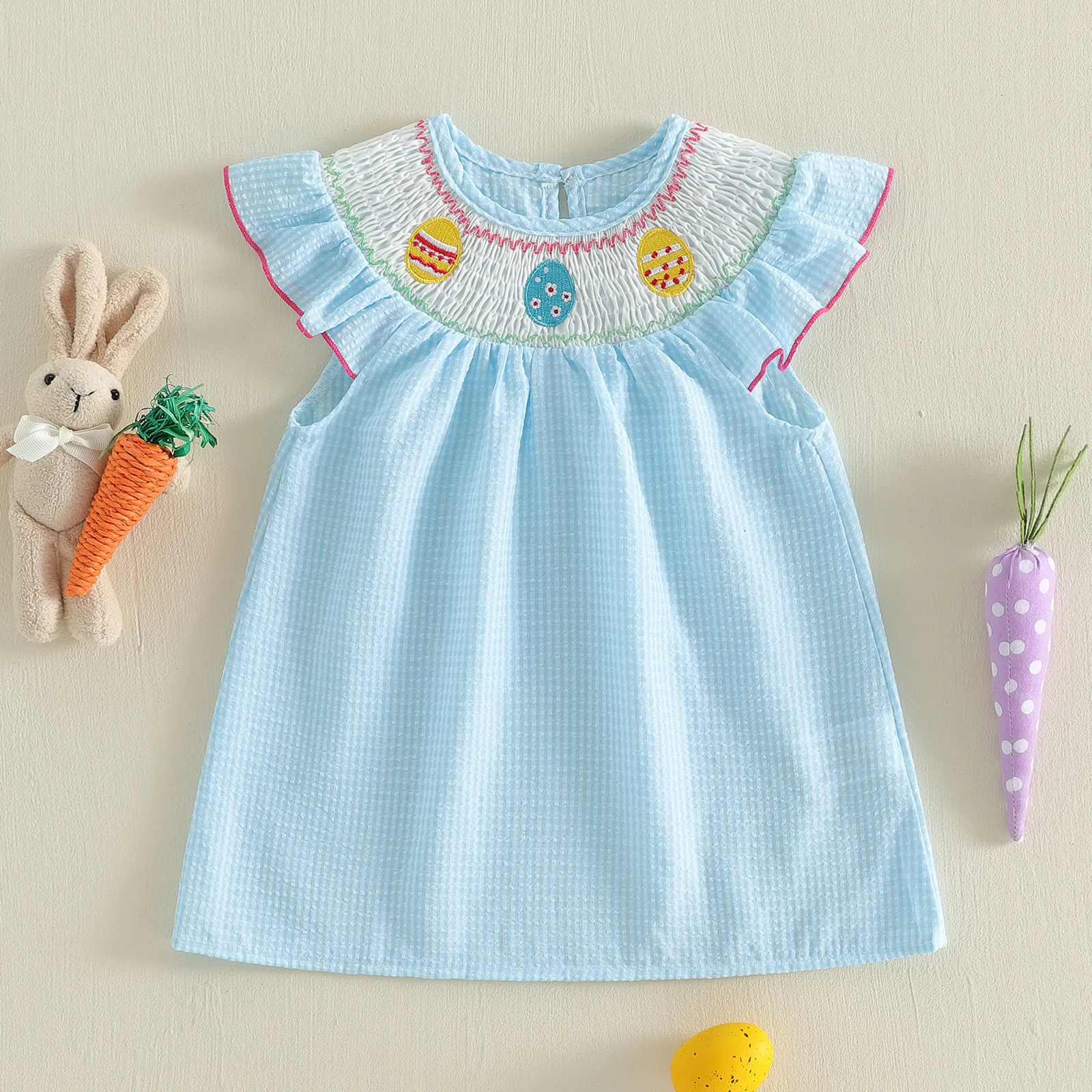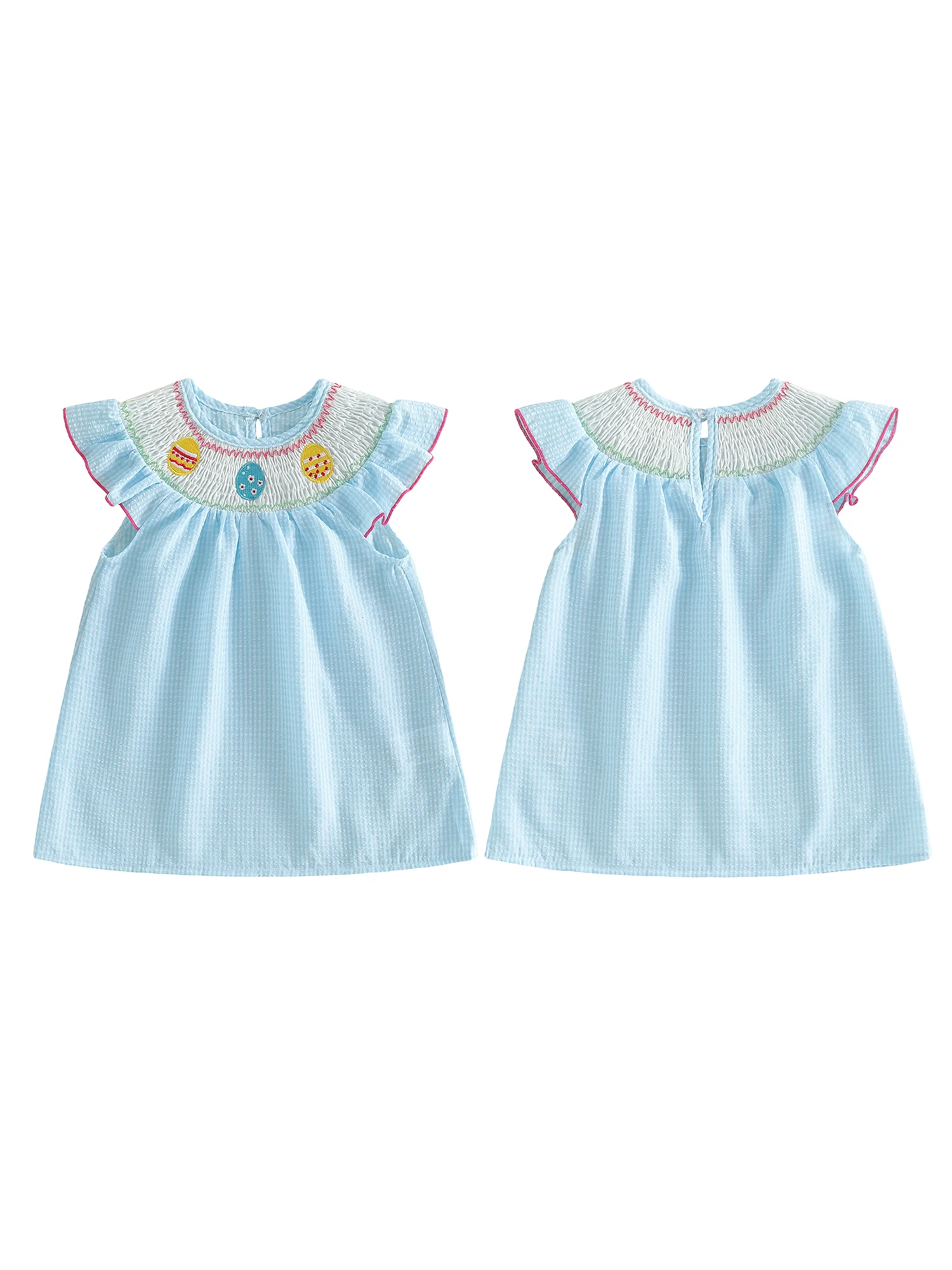- > Vestido infantil para meninas, roupas de páscoa, ovos de páscoa, bordado, manga voadora, gola redonda, moda infantil, vestido casual de princesa