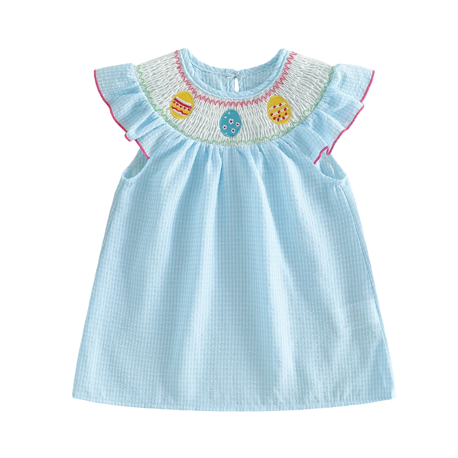 Vestido infantil para meninas, roupas de páscoa, ovos de páscoa, bordado, manga voadora, gola redonda, moda infantil, vestido casual de princesa