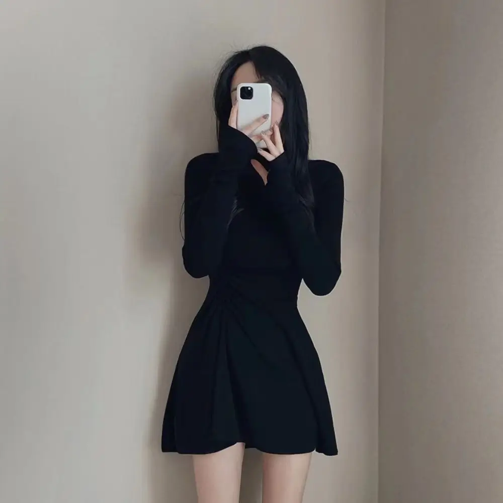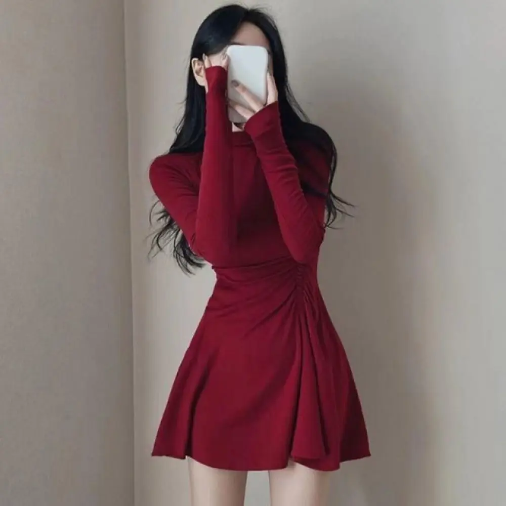 Vestido vermelho de natal de manga comprida, linha a, plissado, irregular, meninas, meia gola alta, saia curta, slim, vestido de festa