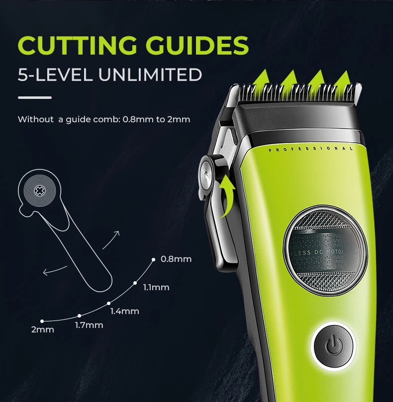 Personalize os comprimentos dos cabelos com uma alavanca fácil de usar que permite ajustes instantâneos e sem ferramentas de 0,8 mm a 2,0 mm.Este mecanismo intuitivo garante controle preciso dos graus de corte, eliminando a necessidade de vários acessórios durante o estilo.