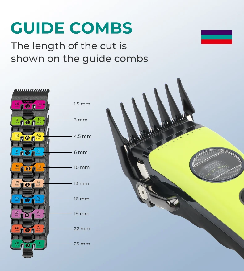 Amplie a versatilidade com 10 pentes guia removíveis (1,5 mm–25 mm), oferecendo um espectro completo de comprimentos de corte para diversos penteados.Os pentes se encaixam com segurança na máquina de cortar, permitindo um corte suave e uniforme em todos os tipos de cabelo, atendendo ao trabalho detalhado e ao corte em massa.