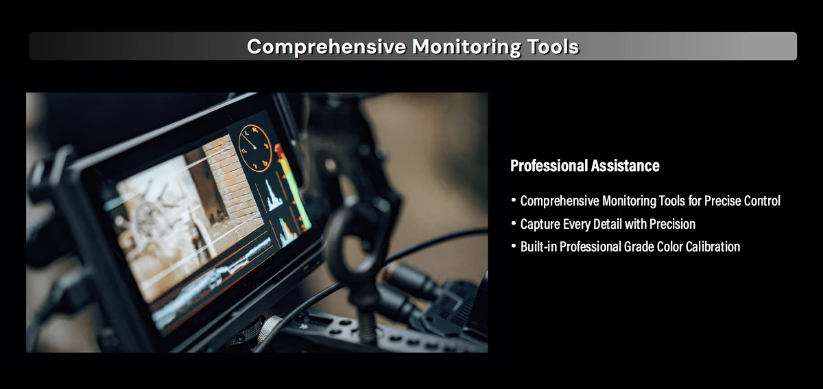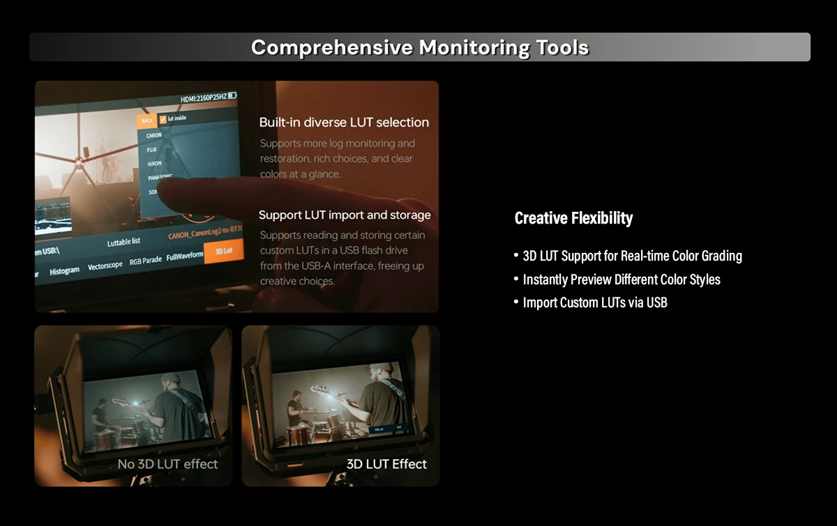 Ferramentas avançadas como waveform e LUT 3D para controle preciso e correção de cores em tempo real.