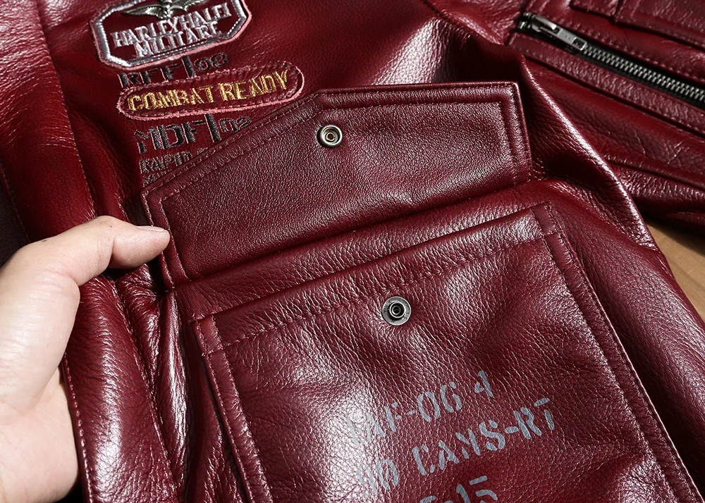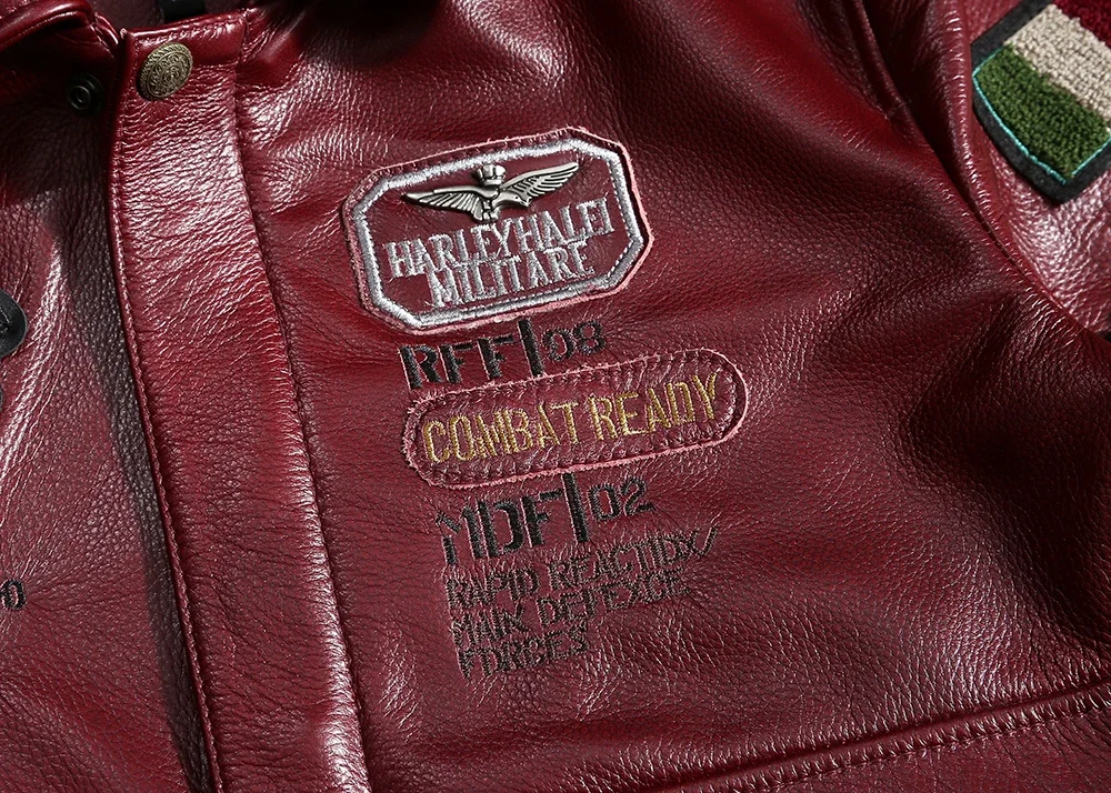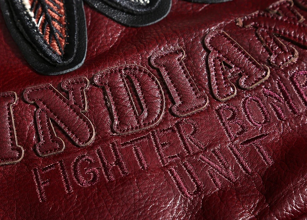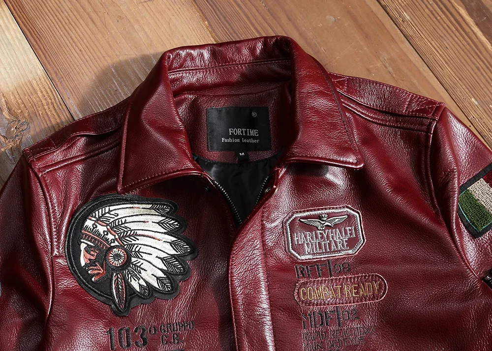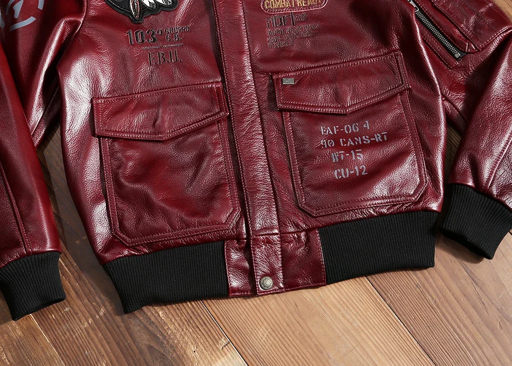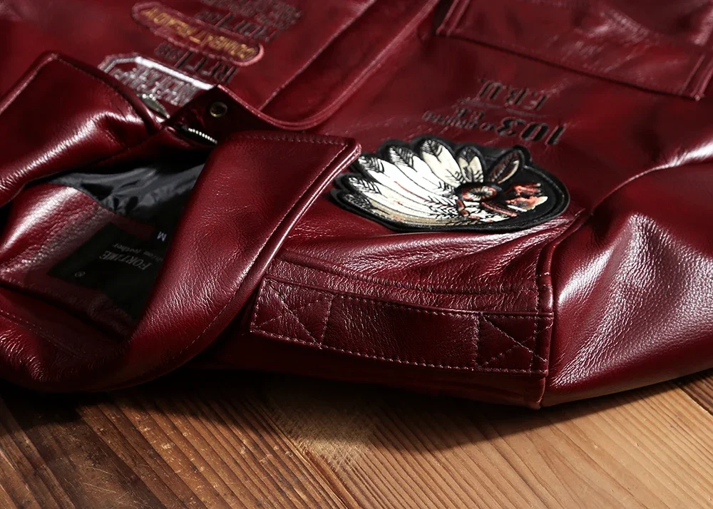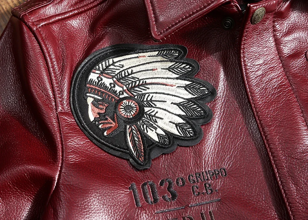 - > Voo a2 piloto indiano couro de vaca motocicleta vinho vermelho jaqueta 100% bordado jaqueta aviador masculino bombardeiro roupas masculinas