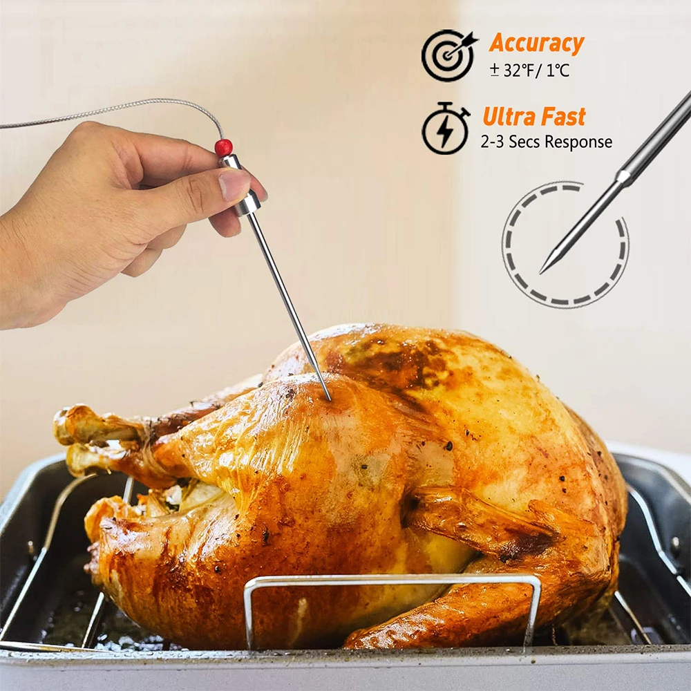 O fio da sonda do termômetro de cozinha resistido a até 716 ̊F (380 ̊C) garante que você possa cozinhar qualquer tipo de carne ou comida, enquanto o cabo de silicone é de apenas 482, perfeito para os entusiastas do fumo.