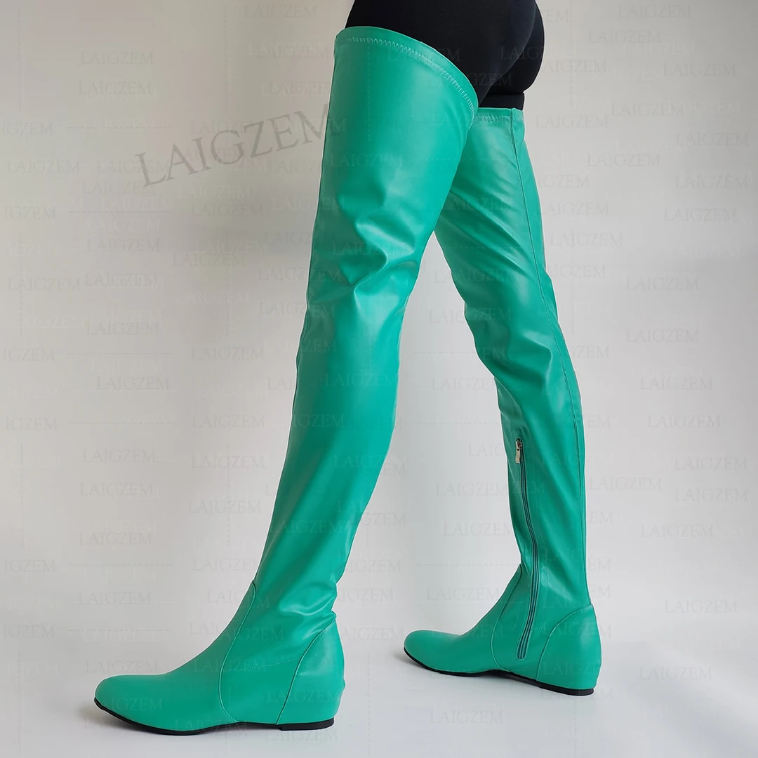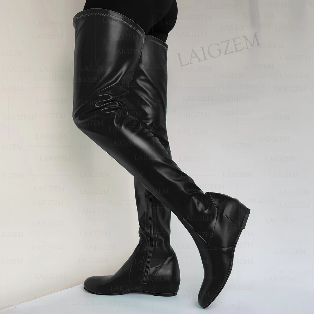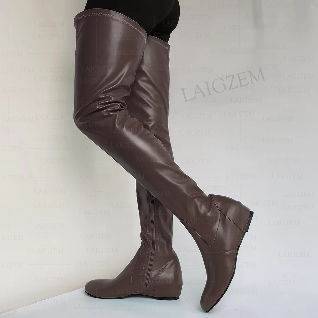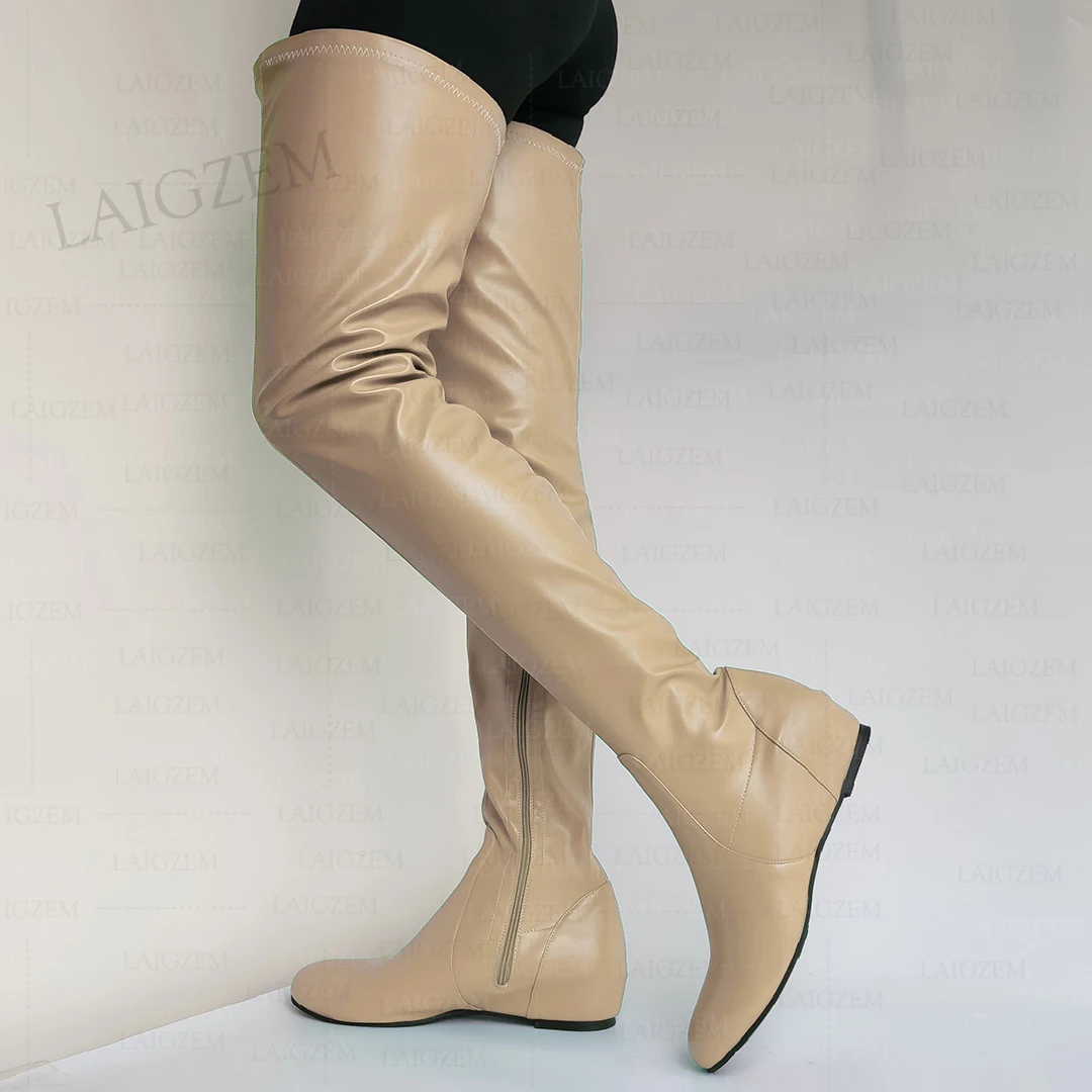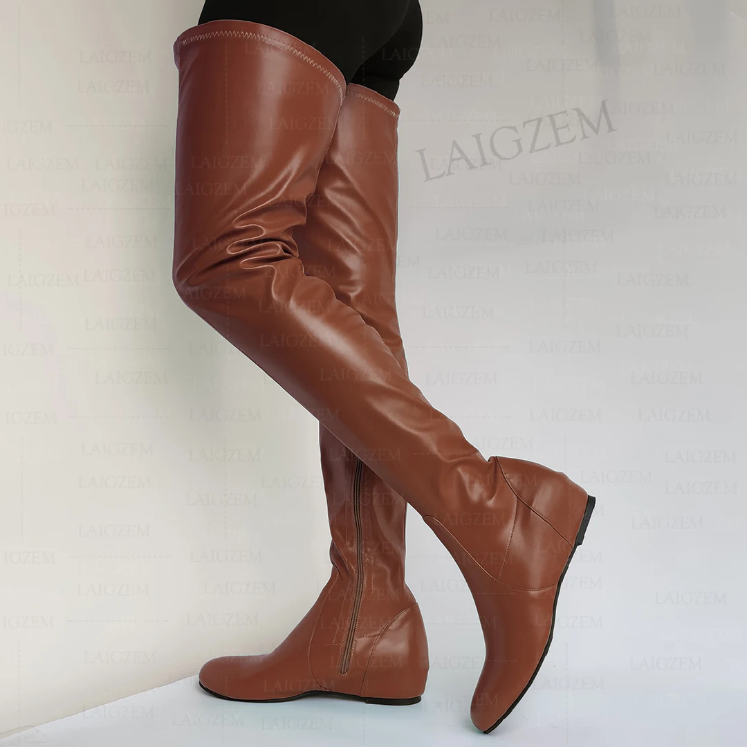 - > Zhima mulheres coxa botas altas de couro falso dedo do pé redondo zíper lateral meados de salto escondido botas senhoras sapatos mulher tamanho grande 37 42 44 50 52