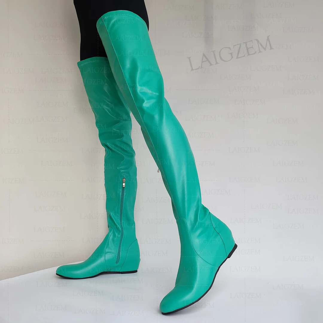 Zhima mulheres coxa botas altas de couro falso dedo do pé redondo zíper lateral meados de salto escondido botas senhoras sapatos mulher tamanho grande 37 42 44 50 52