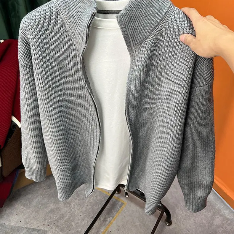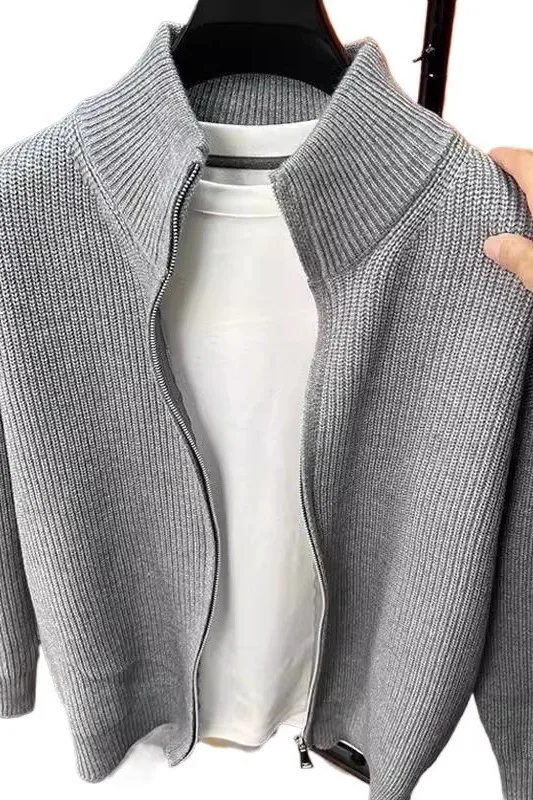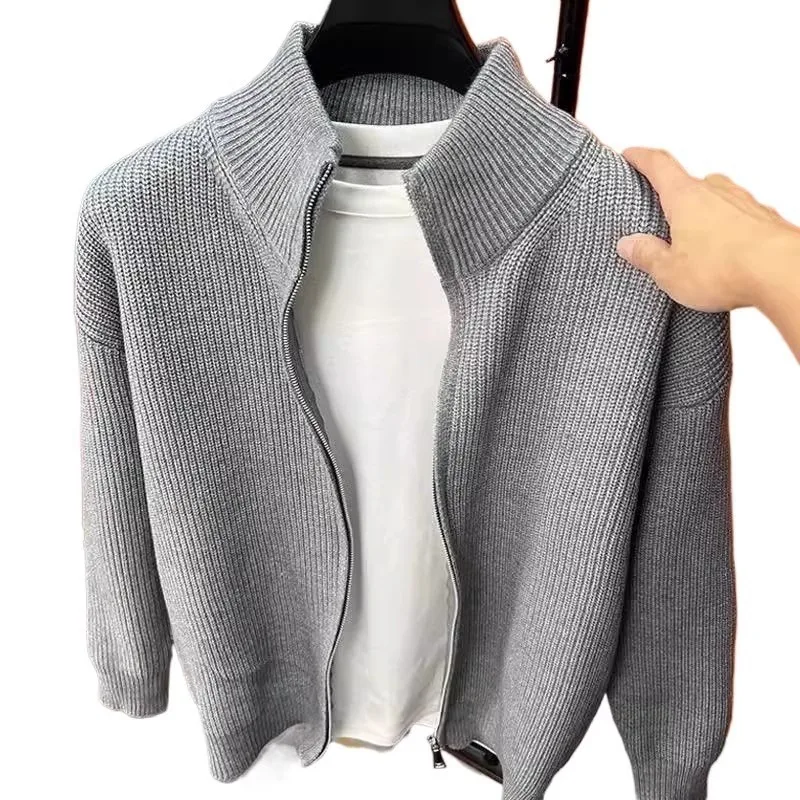 - > Zíper cor pura malha zip up cardigan masculino fino ajuste camisola outono inverno moda outerwear gola meia alta